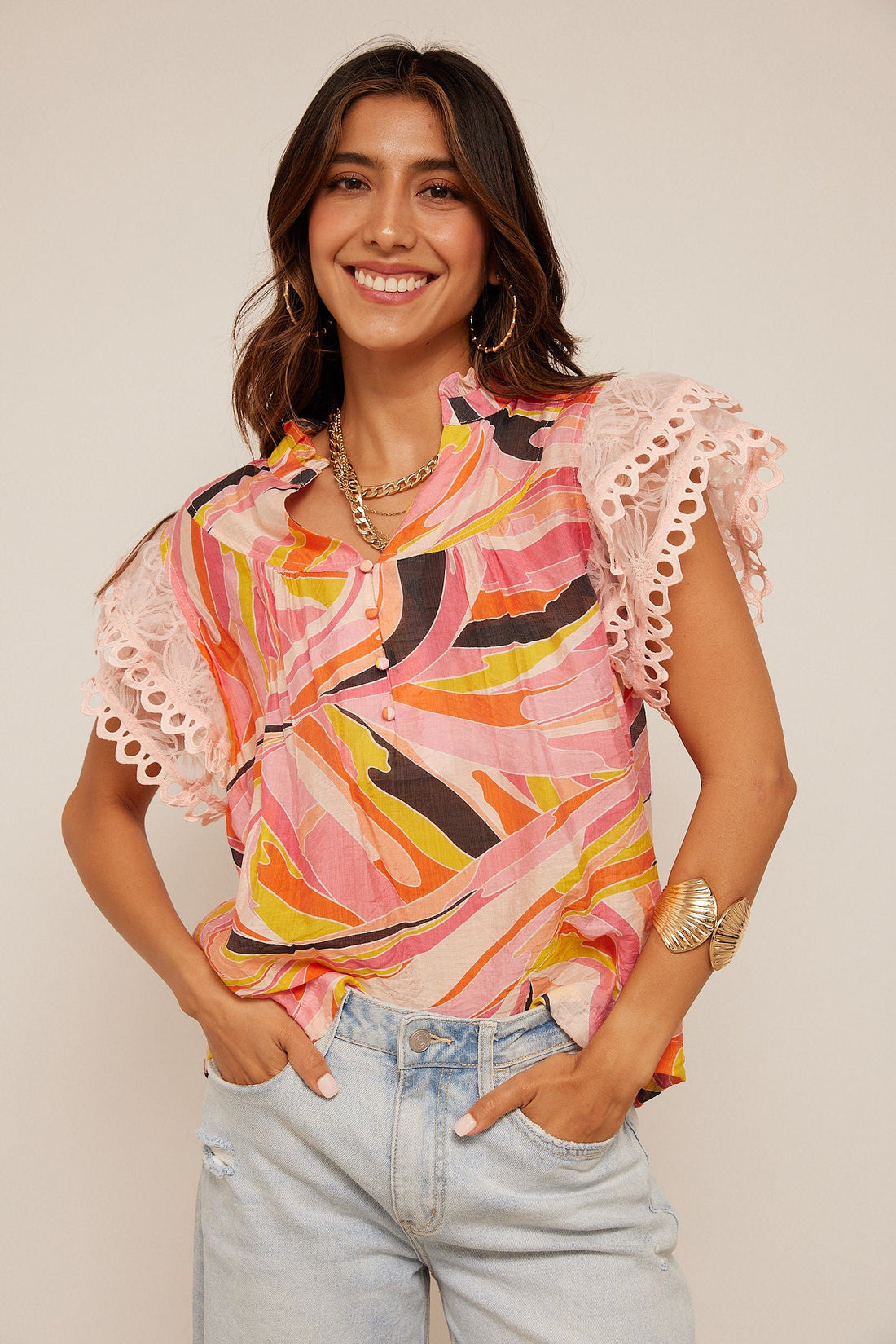 Leela Abstract Print Floral Lace Sleeve Blouse