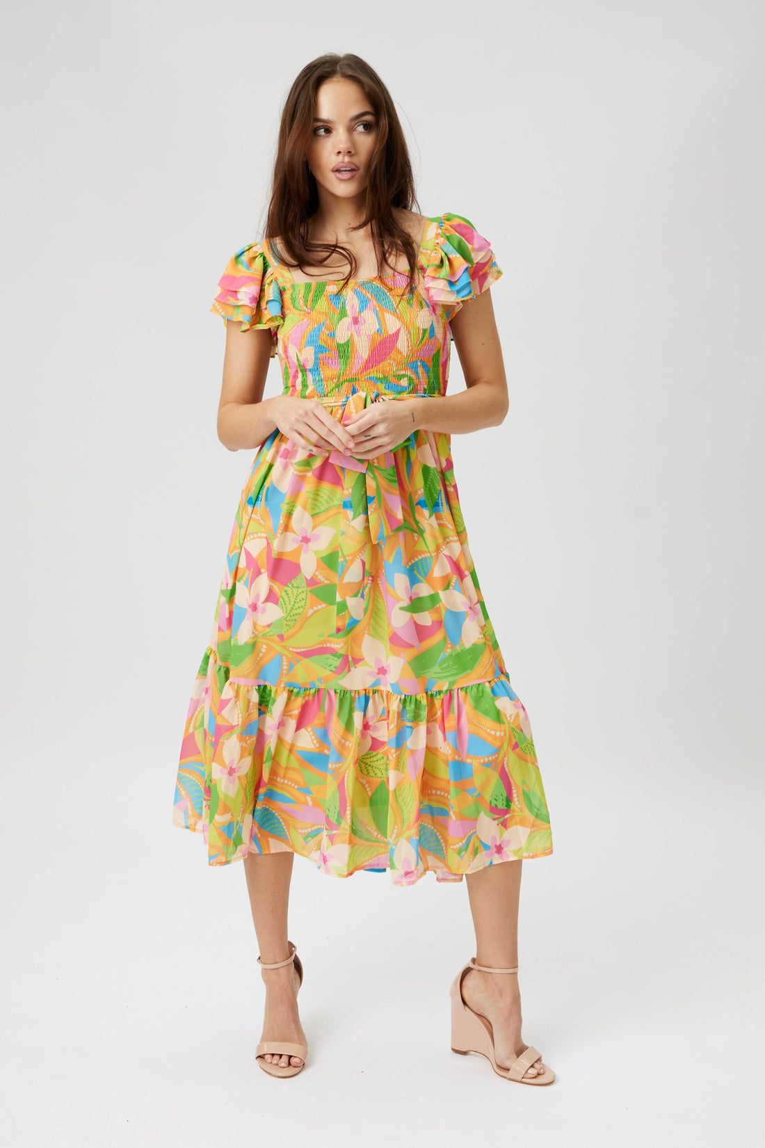 SALE - Olivia Printed Smocked Bodice Midi Dress