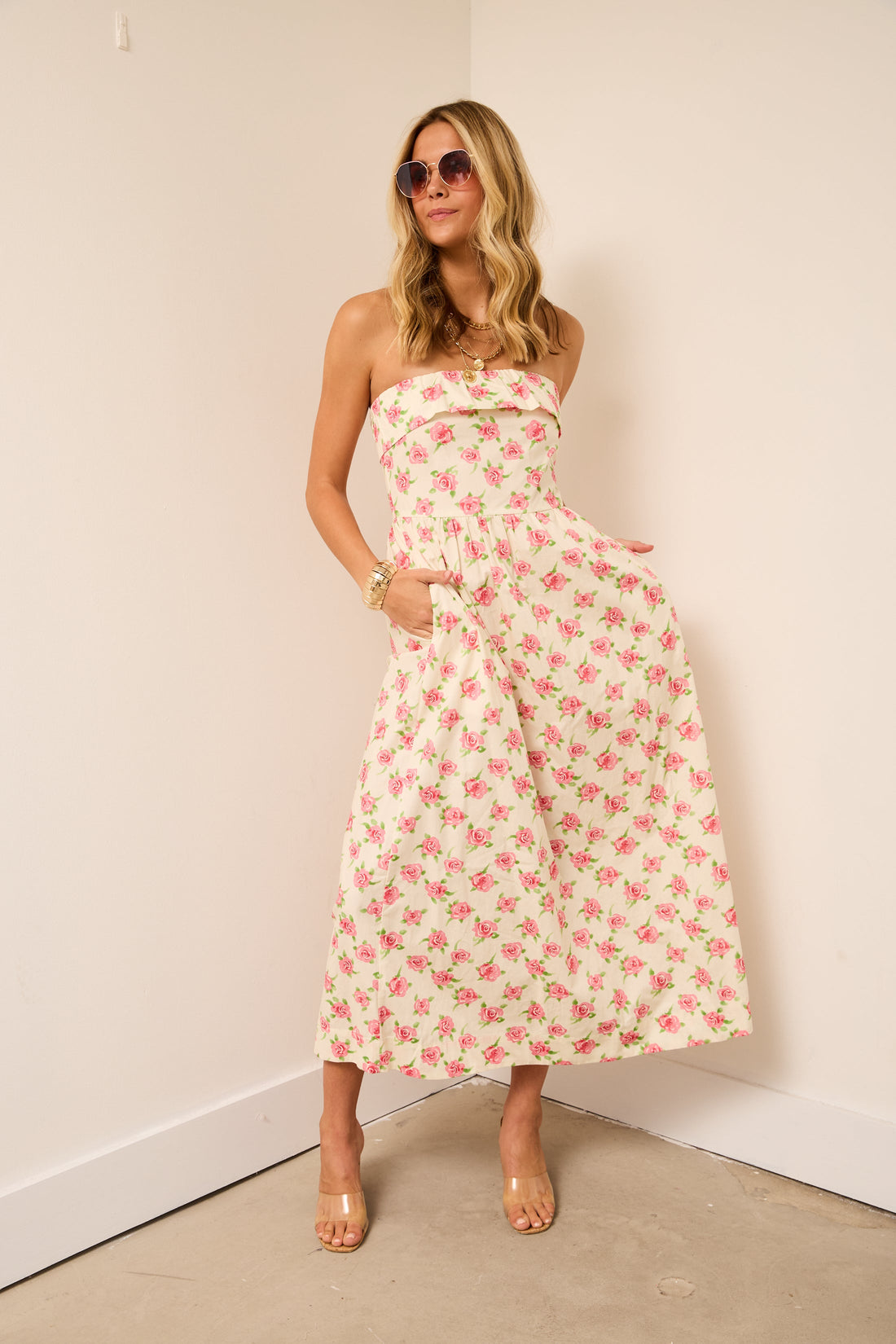 Angelina Floral Embroidery Shoulder Tie Midi Dress