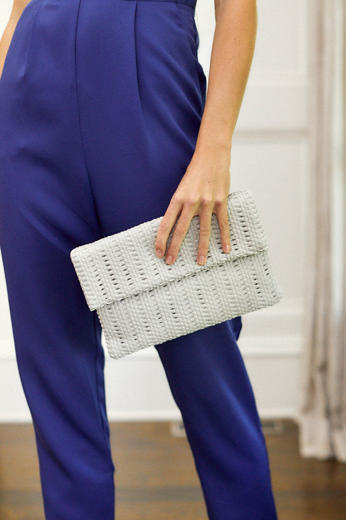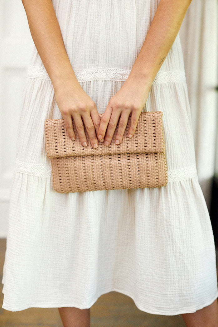 A classic stable! The Addison Clutch features a woven design and a snap front closure.