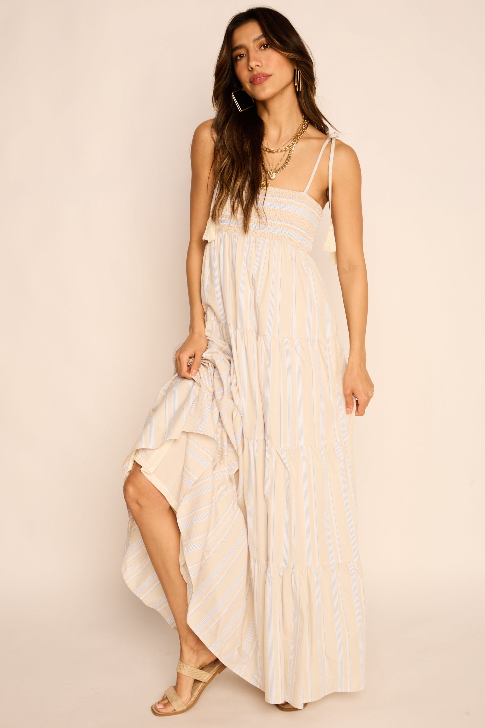 The Adelaide Maxi Dress is a stylish blue striped maxi dress featuring a flowing silhouette, lightweight fabric, and a flattering fit. Perfect for casual outings or beach days, this dress offers effortless elegance and all-day comfort.