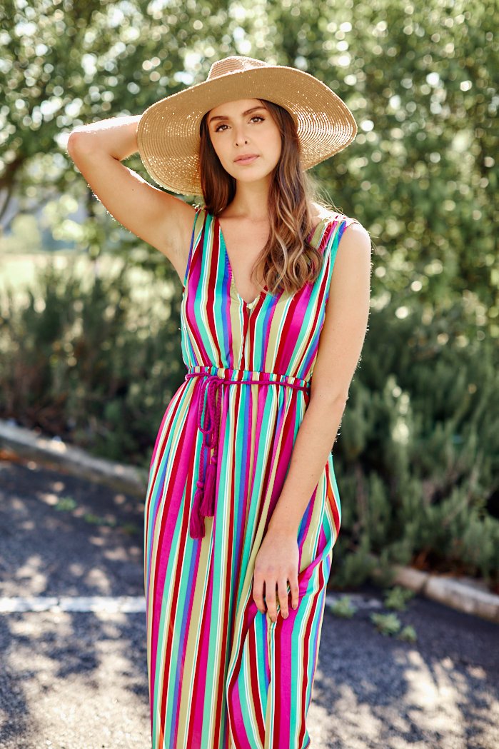 The In The Rainbows striped printed reverse crepon dress is a flowing maxi length number with a deep V-neckline, tassel belt detail and side slits.