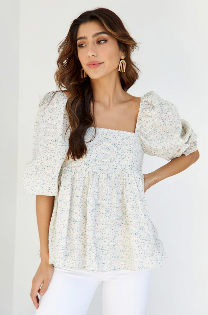 All about the puff sleeves! The Cadence Puff Sleeve Blouse features a square neck, babydoll fit and all over floral details. Pair with your favorite pair of denim and heels to complete the look.