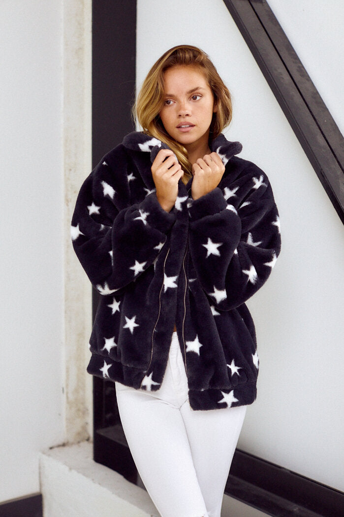 Get cozy in the Campbell Star Print Jacket! This jacket is black with white stars, has side pockets, and zips up the front.