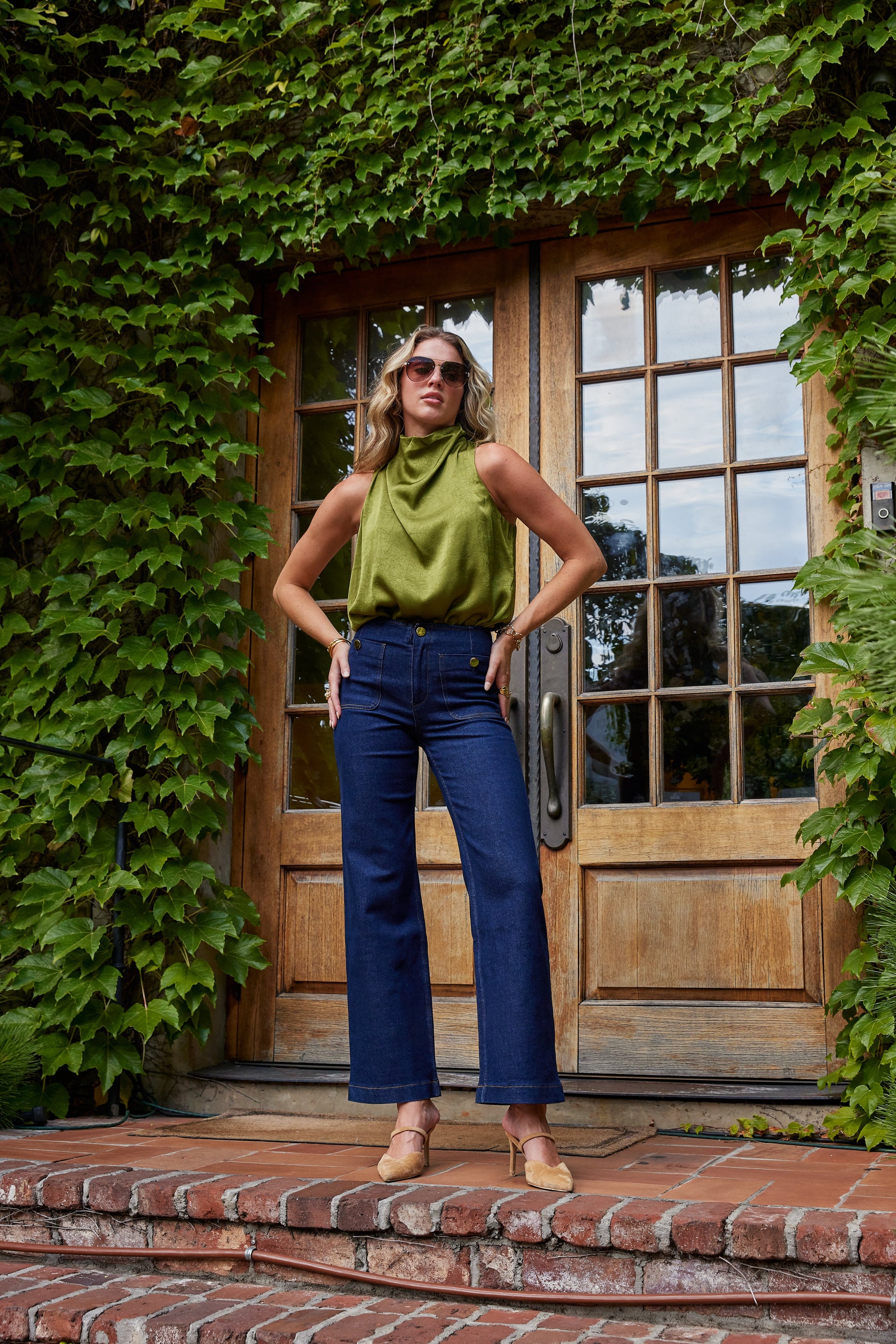 Upgrade your denim game with these high-waisted wide-leg jeans. Designed with a flattering fit and standout details, they feature two oversized front patch pockets with button accents and a classic button-and-zip closure. The dark wash with contrast stitching adds a timeless yet modern edge, making them easy to dress up or down.