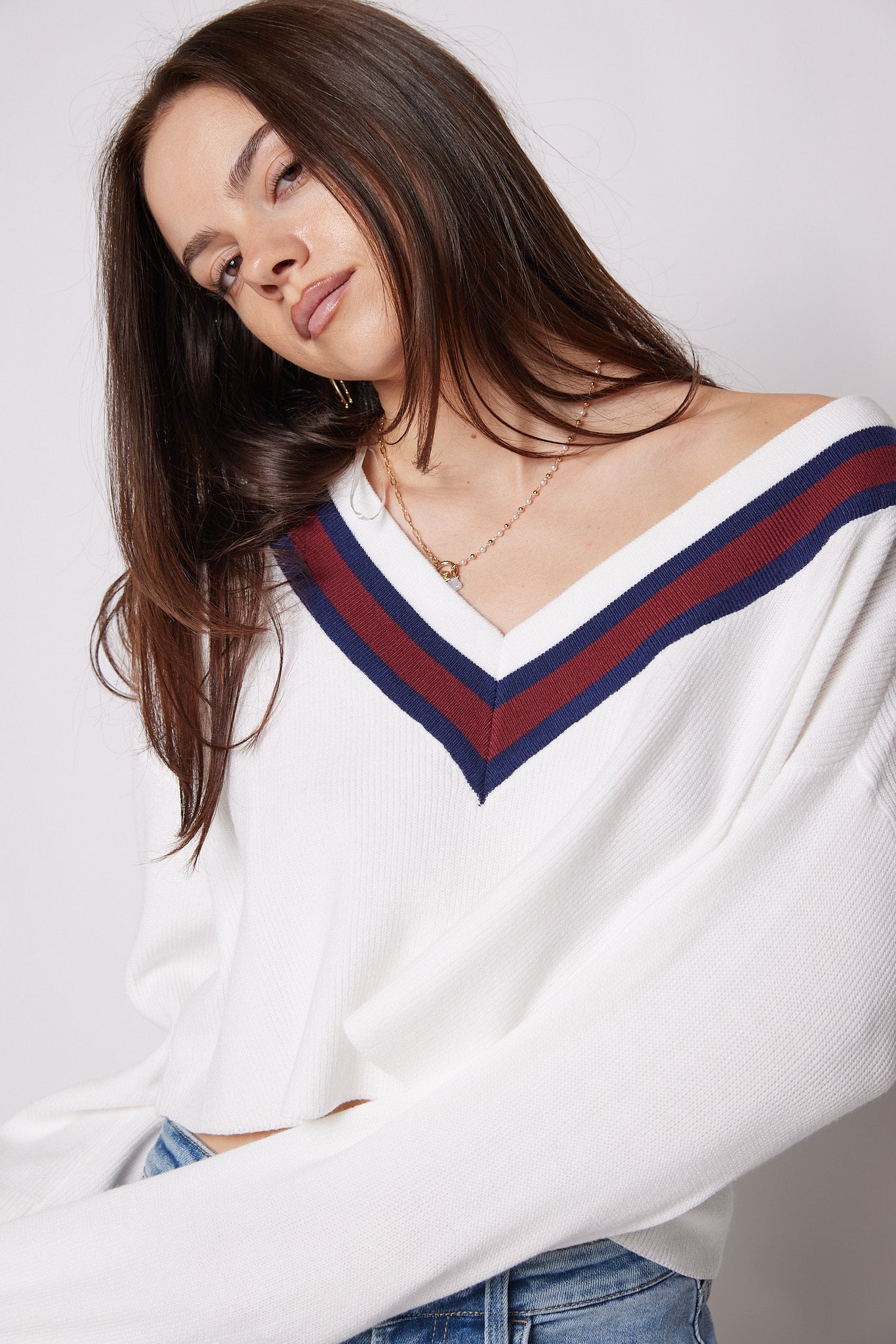The Devon Contrast Striped Sweater is the perfect blend of style and comfort. With a v neck and slouchy fit, this long sleeve sweater is both trendy and relaxed. Its colorblock design adds a touch of personality to any outfit.