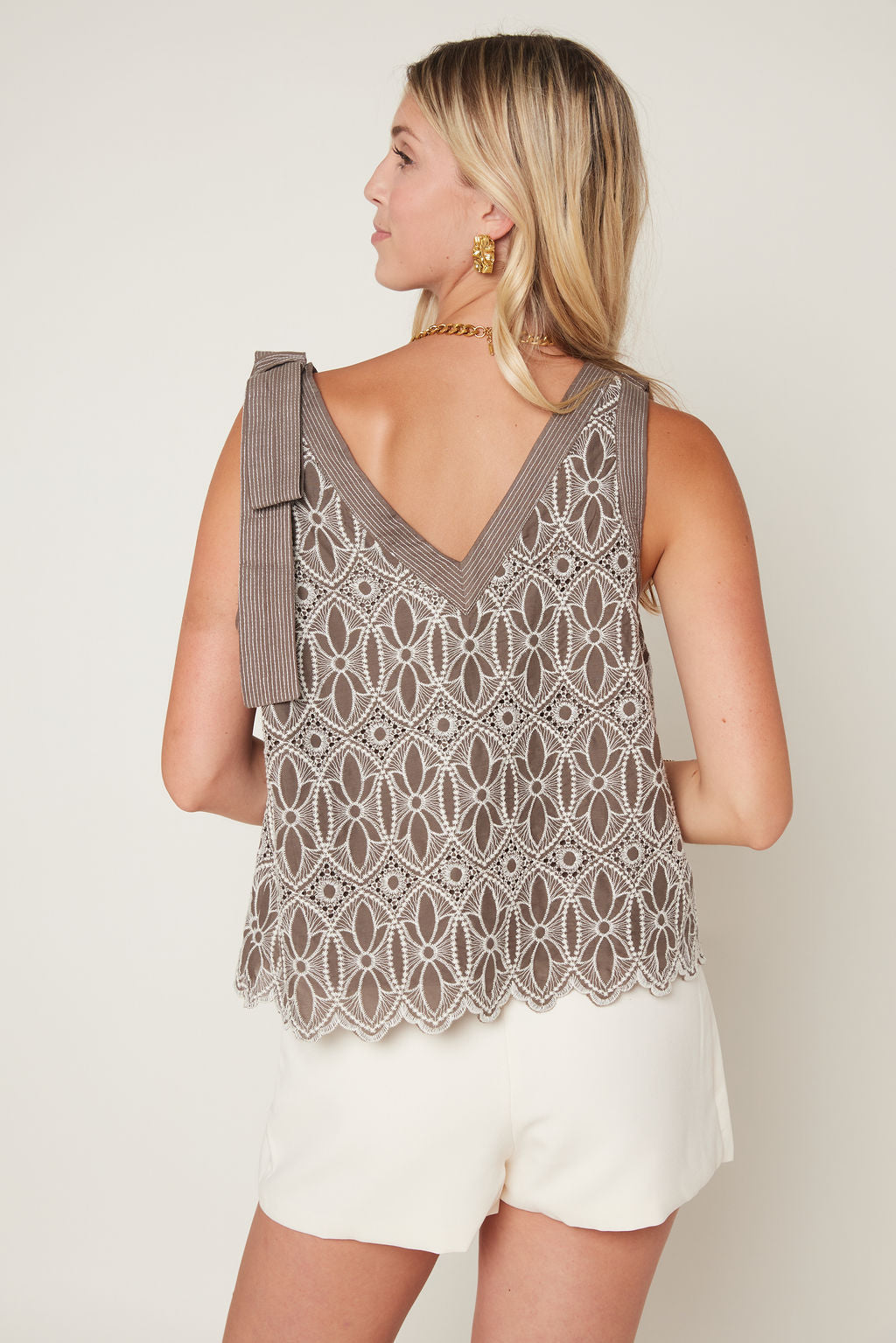- Sleeveless with tie-shoulder straps (striped detail on straps)
