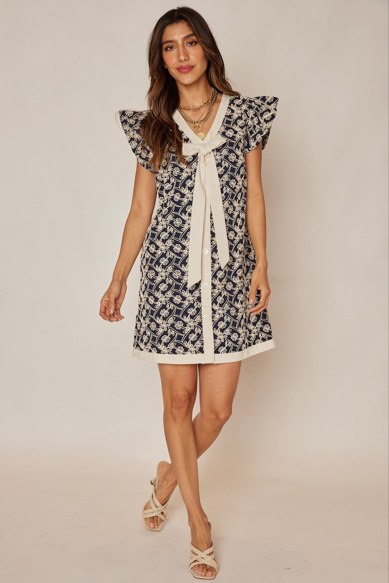 This chic and elegant dress features a delicate navy and cream print with intricate detailing. The ruffle sleeves and bow-tie neckline add a feminine touch, while the button-down front and contrast trim create a polished look. Perfect for both casual and dressy occasions.