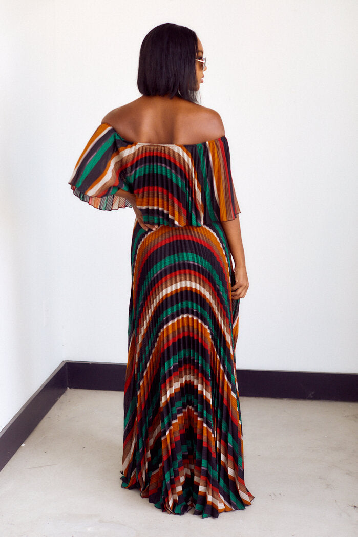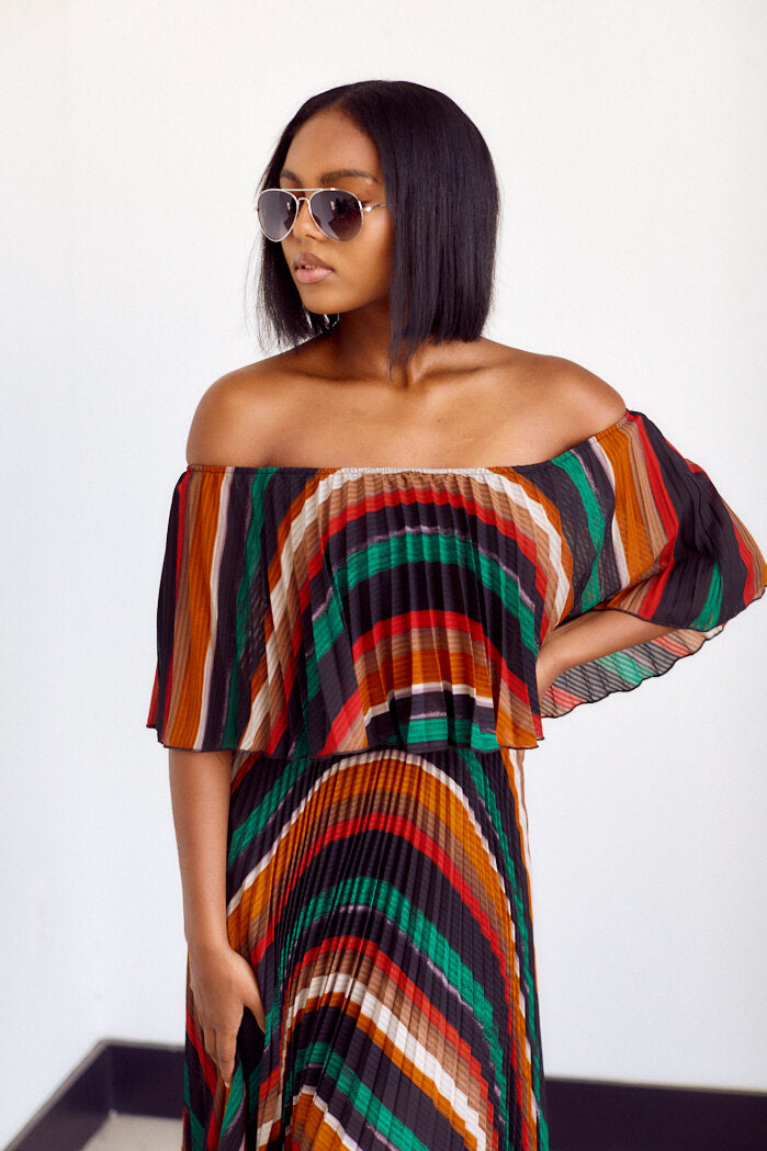 Make a statement in the Elodie Off The Shoulder Striped Maxi! This dress features an off the shoulder design, elastic waist, and pleats throughout. Style this maxi dress with heels to complete the look.