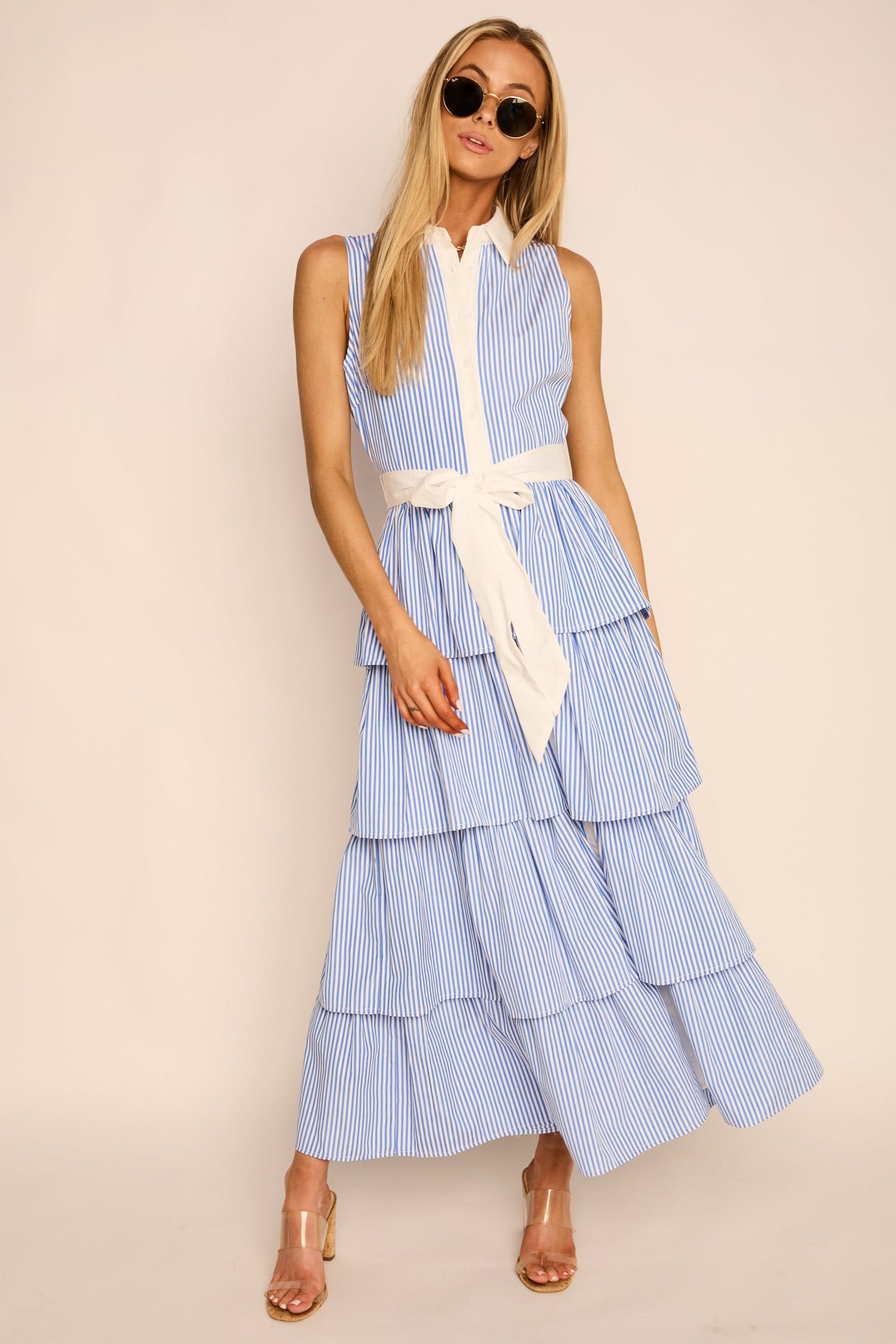 Elevate your spring wardrobe with our stunning Emily Collared Pleated Stripe Dress. The tiered bottom adds a playful touch to this elegant piece, perfect for any occasion. Embrace the season in style and stand out from the crowd with this must-have dress.