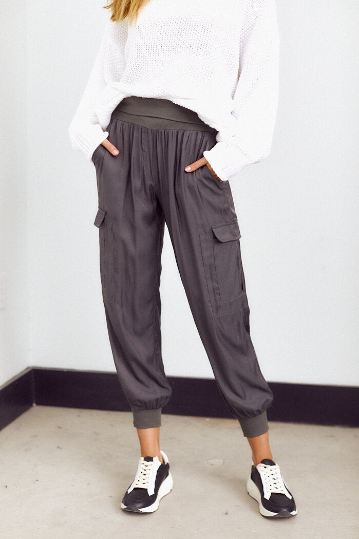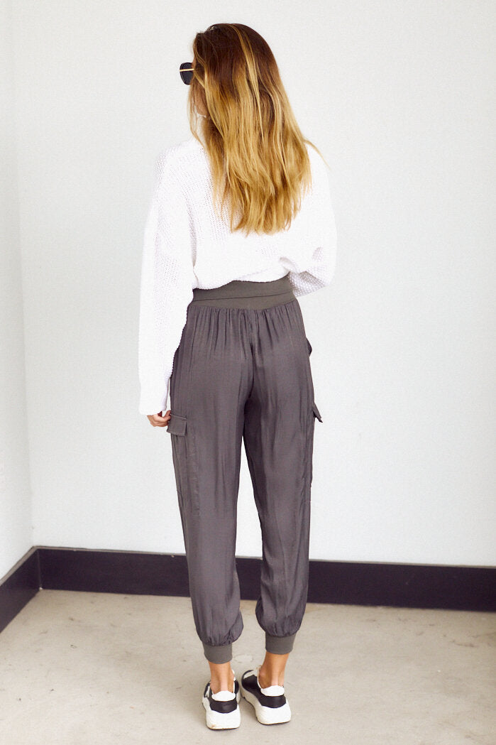 The utility trend gets a feminine update with the Emmet Jogger. These joggers feature knit elastic waist and ankle bands, cargo pockets, and a silky, satin-like material. Throw on with a graphic tee and leather jacket for effortless fall styling.