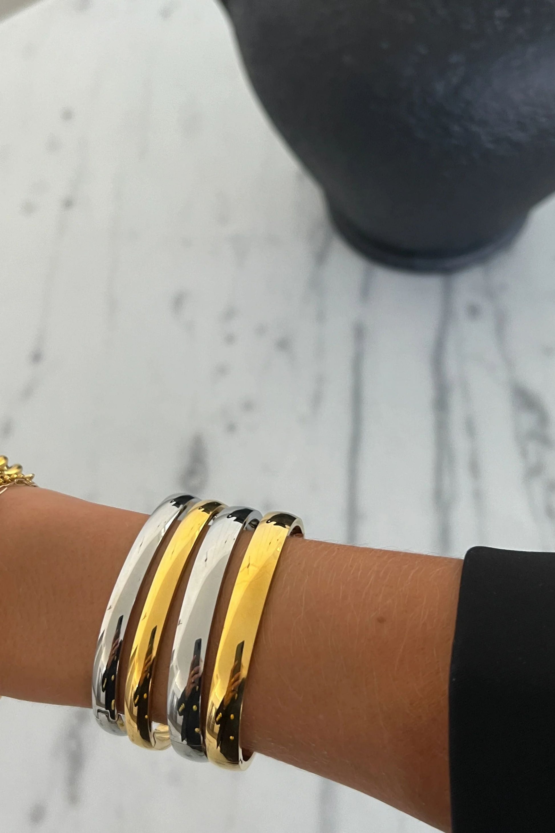Sleek, timeless, and endlessly versatile—the Gemma Bangle is a jewelry-box essential. Available in both 4mm and 6mm widths, this polished bangle offers the perfect fit for your personal style. Wear the slimmer version for a subtle, minimalist touch, or opt for the thicker size for a bolder statement. Stack them together for a chic, layered look that transitions effortlessly from day to night.