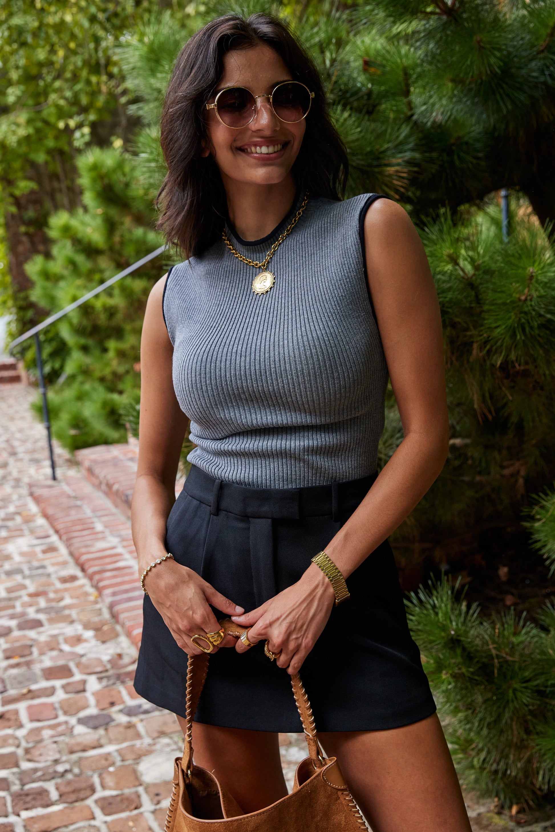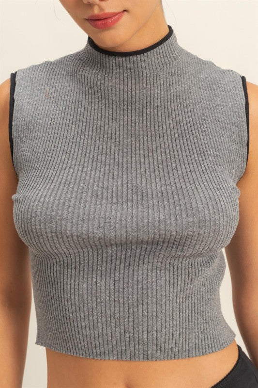 Cozy up in autumn style with this sleeveless knit crop top, featuring a chic turtleneck and bold black trim for just the right touch of edge. Perfect for layering under oversized flannels or pairing with high-waisted jeans and boots, this piece brings warmth and attitude to your fall wardrobe. The cropped cut keeps it playful, while the soft knit and snug neckline give off all the cozy vibes! No sleeves, no problem.