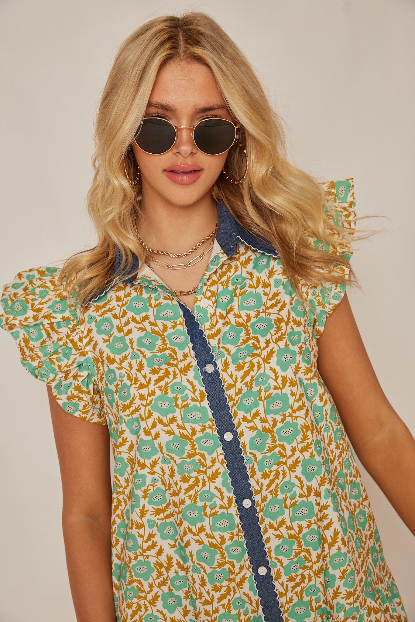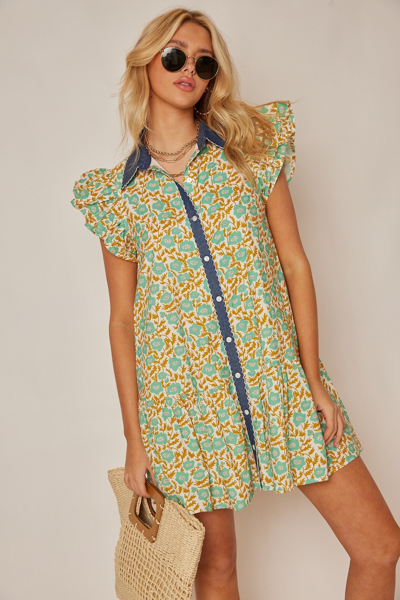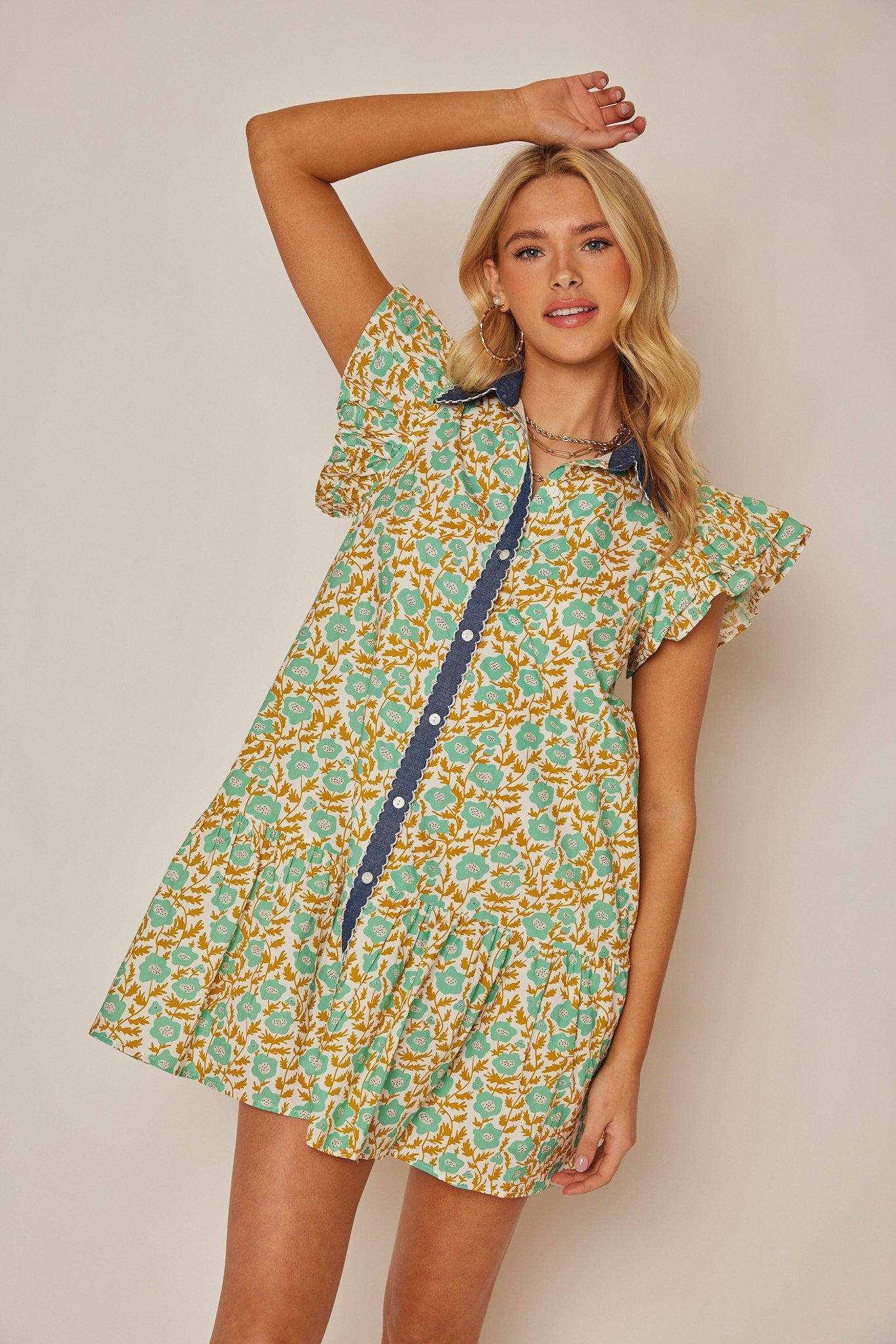 Introducing the Hollis Denim Detail Floral Dress! Perfect for all your spring adventures, this flowy dress adds a touch of whimsy to your wardrobe. With a fun floral design and a playful denim accent, this dress is sure to become a go-to favorite.