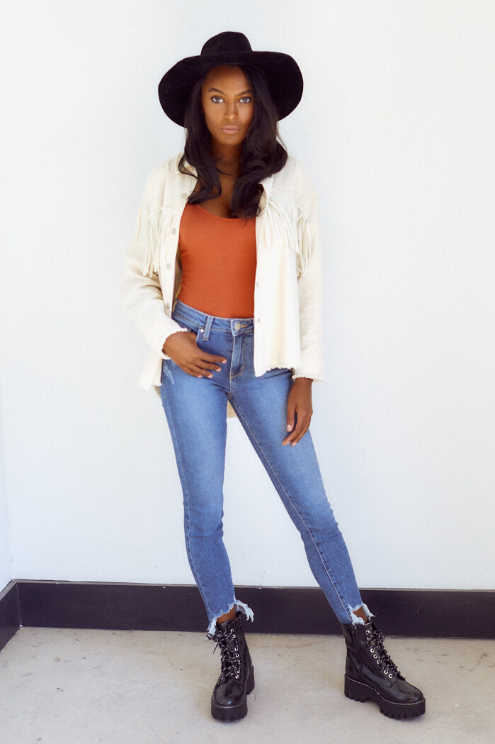 Make a statement in the Idora Fringe Detail Button Down Shirt. This shirt features a collar neck, buttons down the front, and fringe detailing along the chest that wraps around the back. Style this top with denim and fun booties to complete the look.