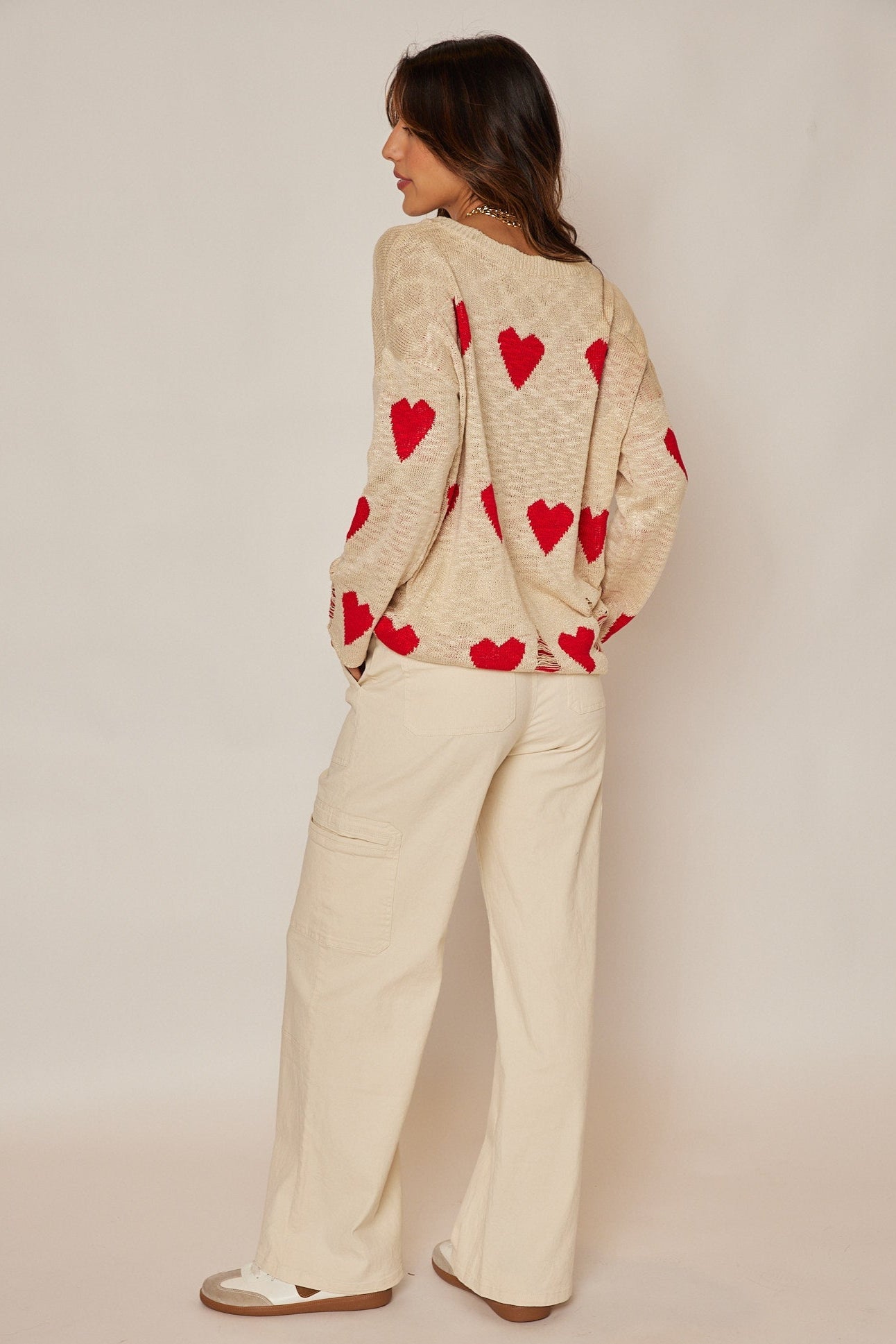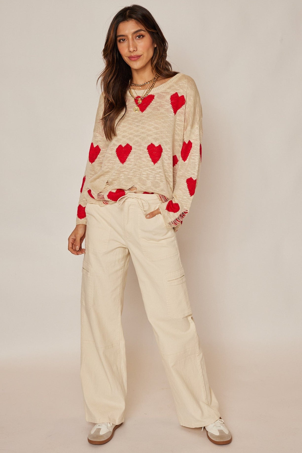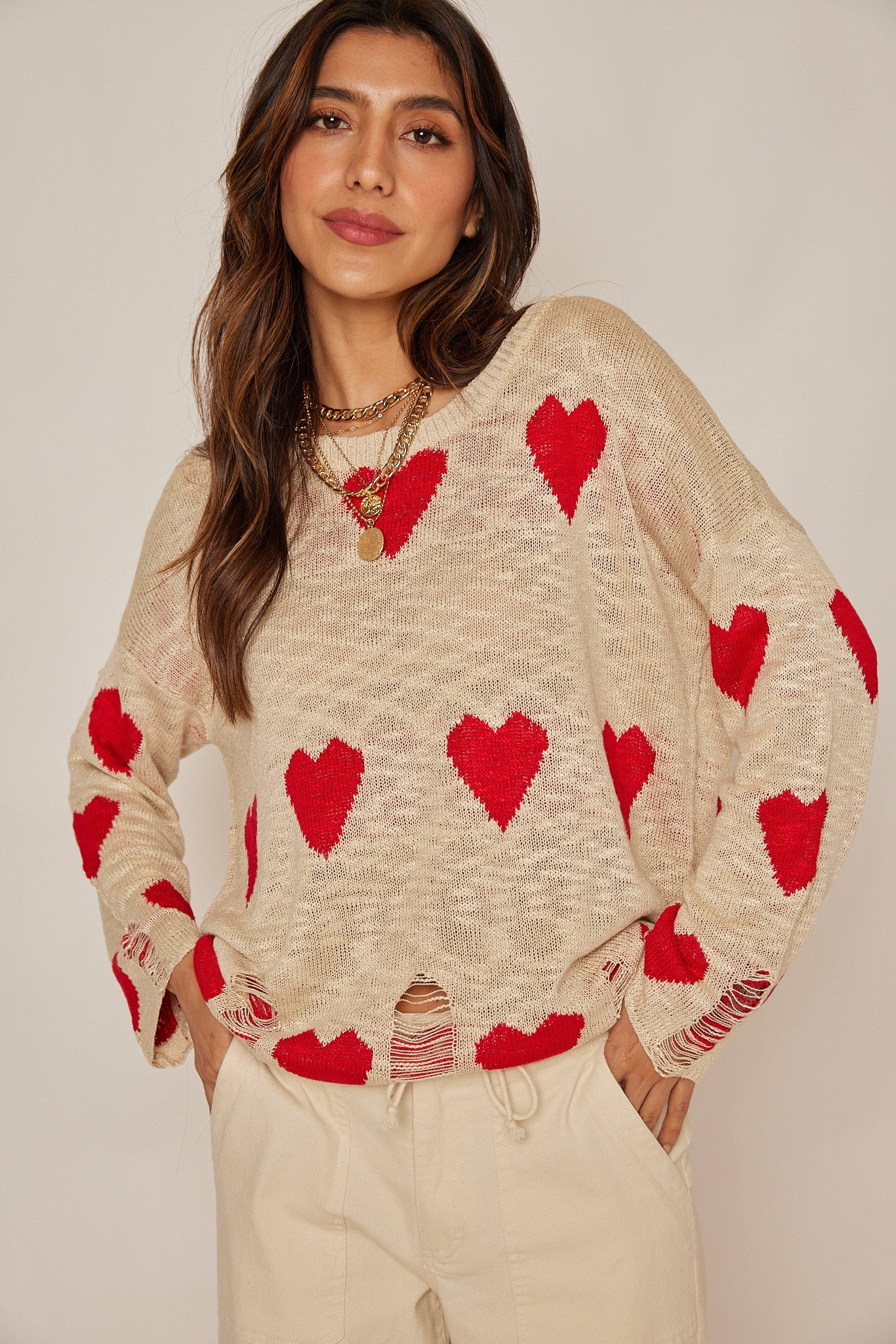 Celebrate Valentine's Day with the Isabel Distressed Color Contrast Heart Sweater. This playful sweater features a fun heart design, adding a touch of style to your wardrobe. Perfect for a casual Valentine's Day date or for spreading love all year round!