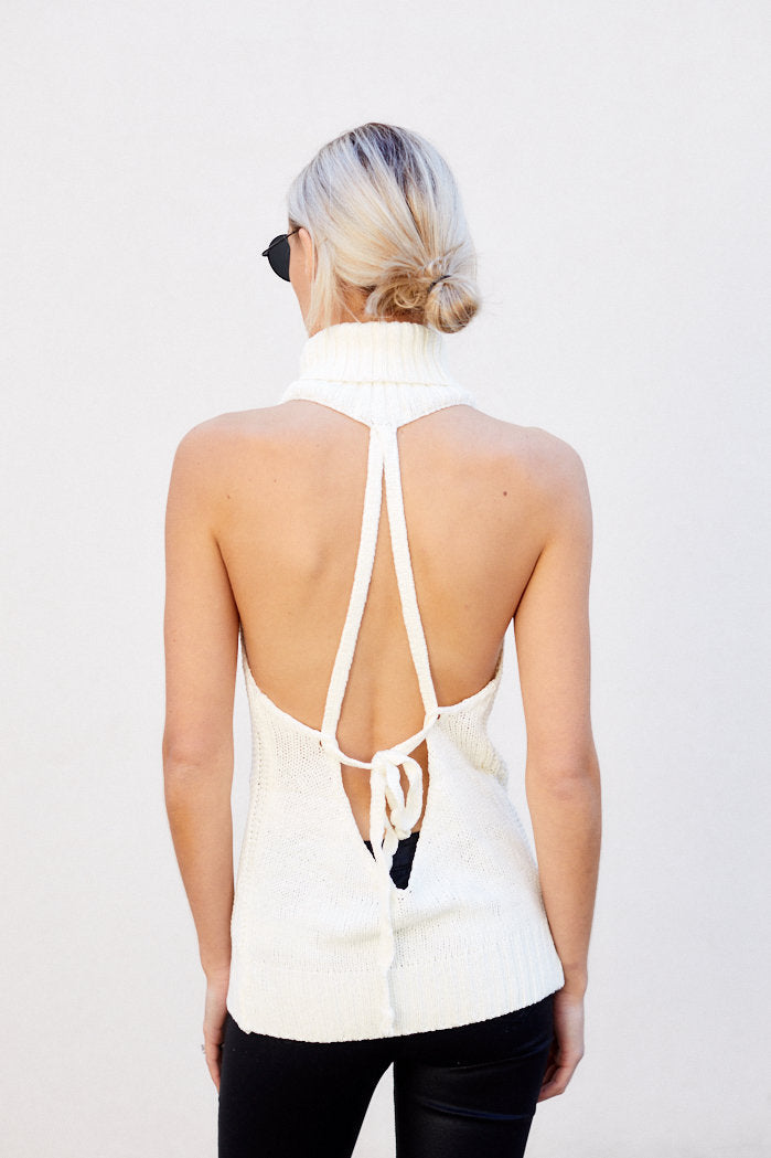 Sleeveless, turtleneck sweater features an open back with an adjustable tie in back.