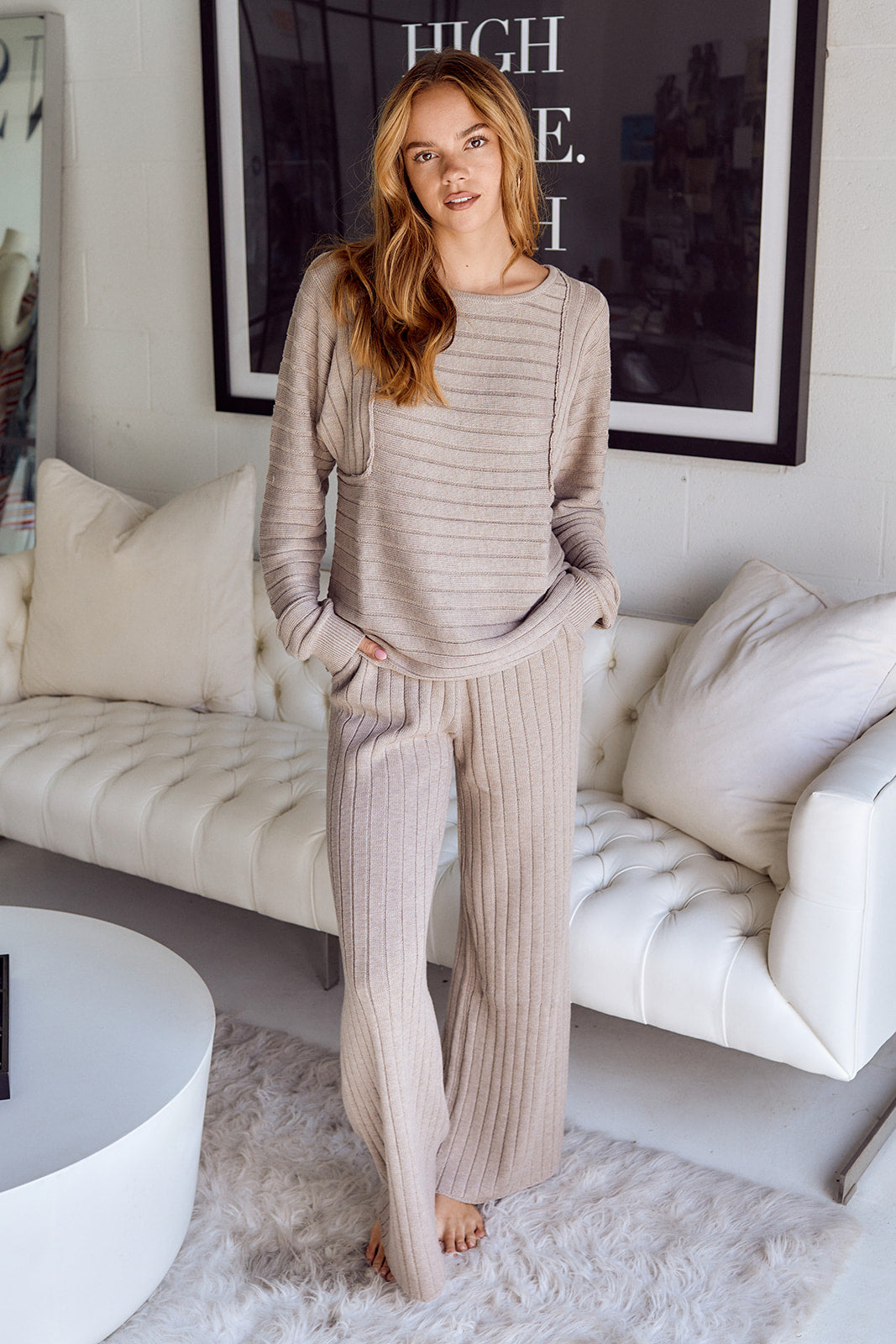 Knit along pooling wide-legs, the Juliet Ribbed Lounge Pants minimal, yet cozy take on luxe loungewear. Drawstring waistband. Hip slant pockets. Pull-on style.
