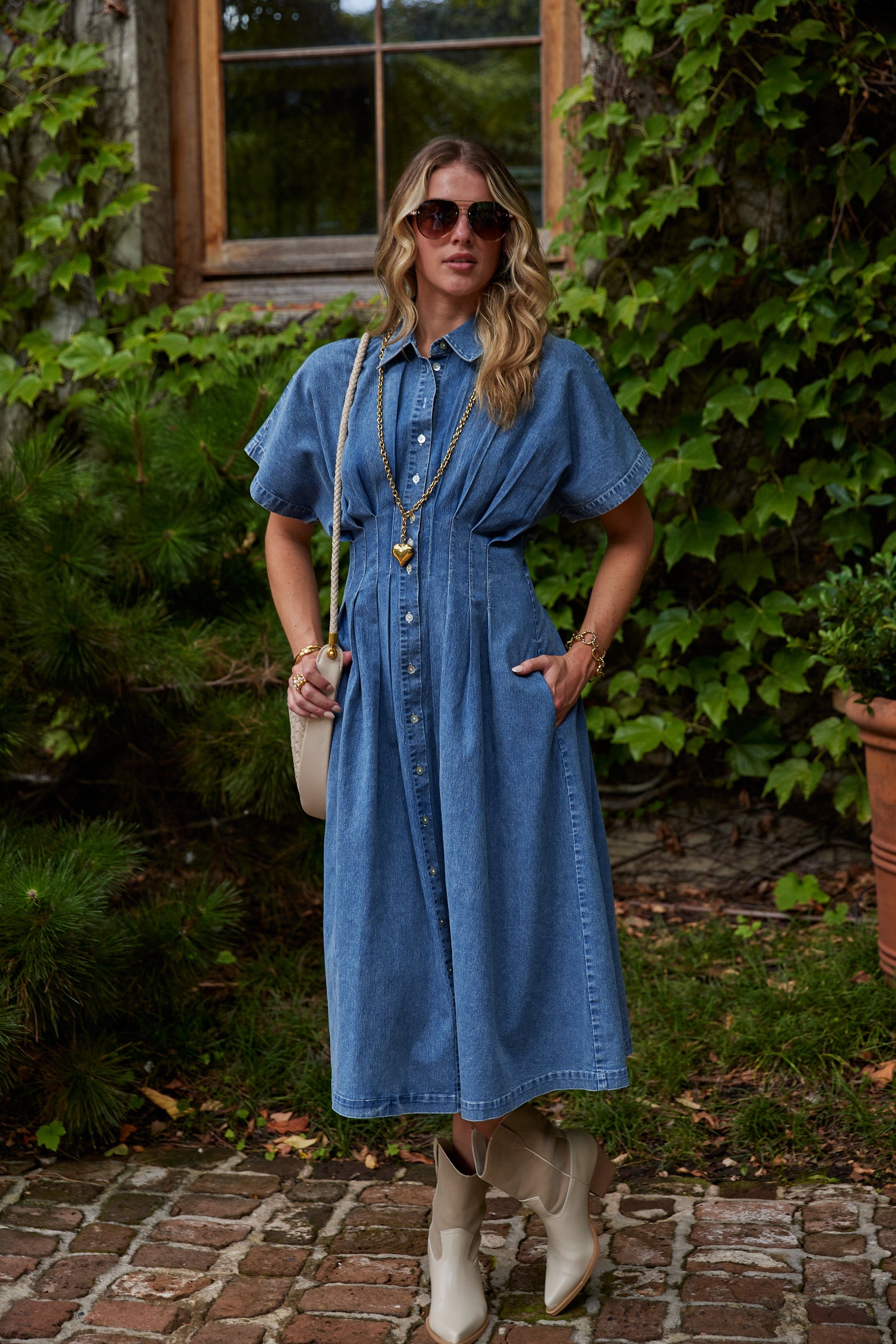 Effortlessly cool and endlessly versatile, the June Dress is a modern take on the classic denim staple. Designed with a button-down front, collared neckline, and puff sleeves, this midi dress brings just the right mix of structure and femininity. Perfect on its own or layered for year-round styling.