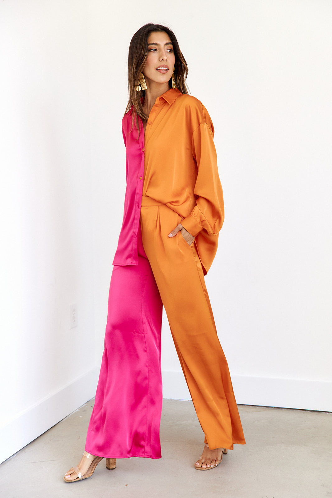 This blouse features a two toned silky satin fabrication with a collared button front and tunic length. Pair with the matching Jupiter Two Toned Pant.