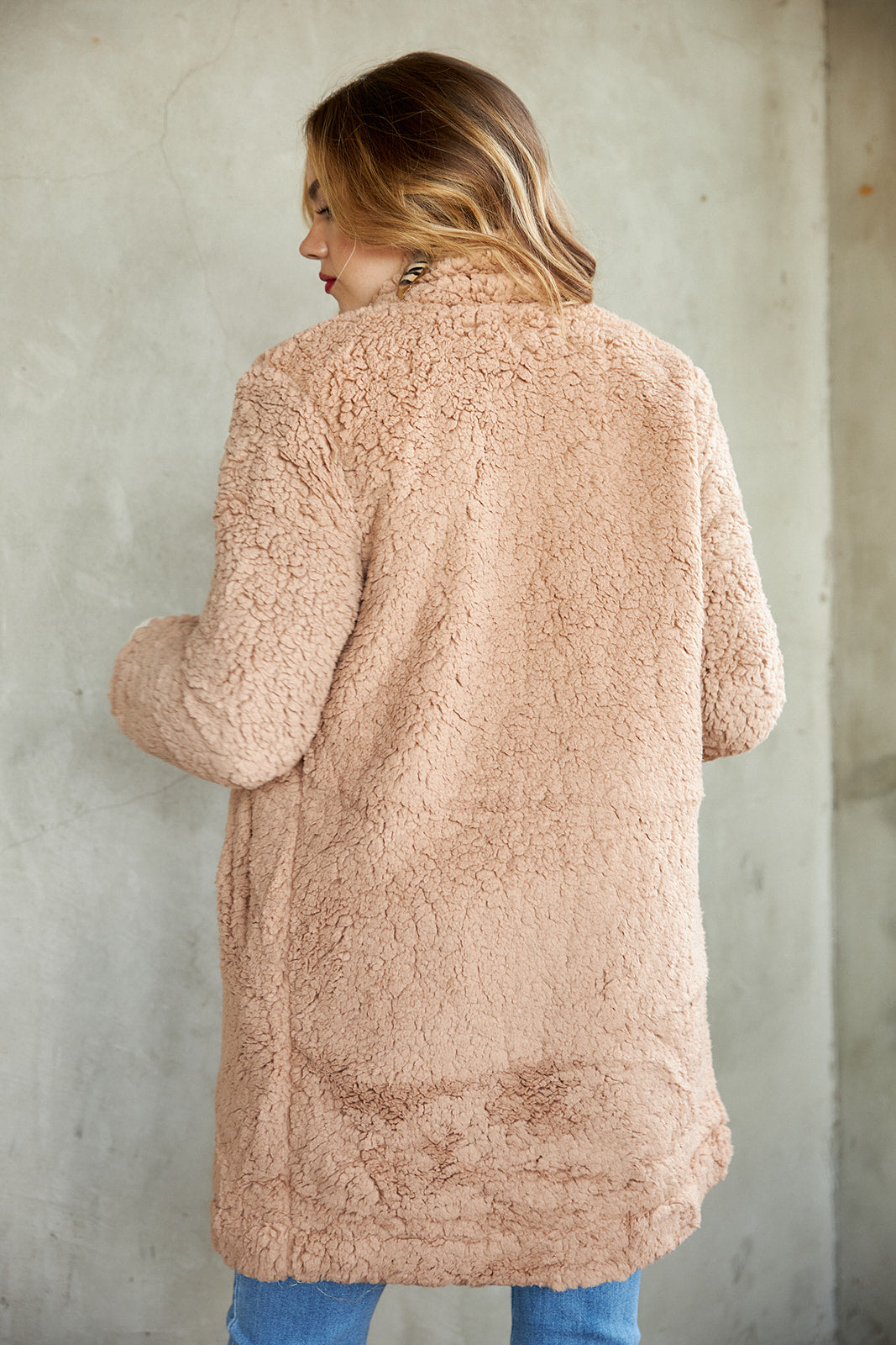 Dress up any outfit in cozy shearling with the Kelzie Teddy Coat! This teddy coat hits mid-thigh in length and features front pockets. Pair over any outfit to complete this winter chic look.
