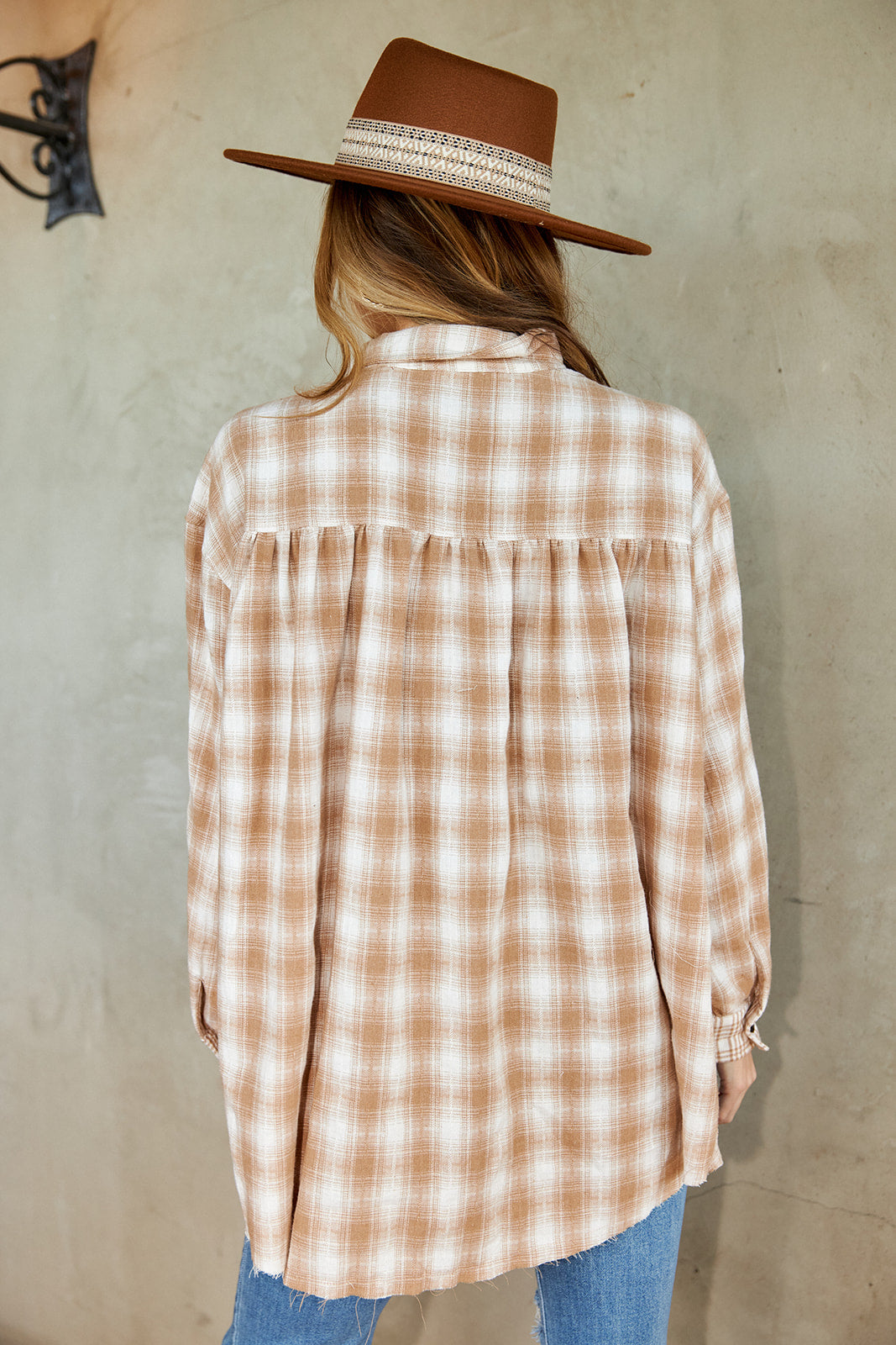 Effortlessly cozy in tan plaid flannel, the Lafferty Plaid Flannel button-down is a casual everyday staple. This top is draped in a high-low fit and is slightly oversized. Pair with light wash jeans and a hat all fall long!