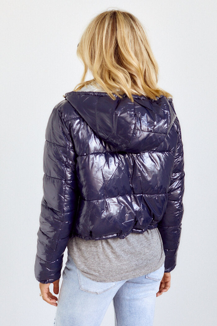 Stay chic in the Leigh Puffer Jacket. This jacket features a zipper front, hood in the back, and metallic fabric throughout.