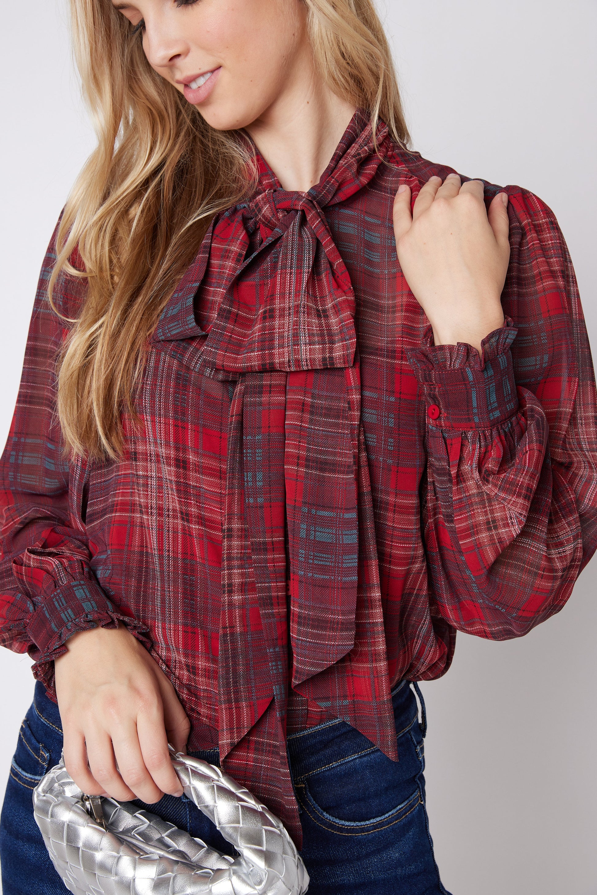 SALE - Lena Plaid Tie Neck Blouse