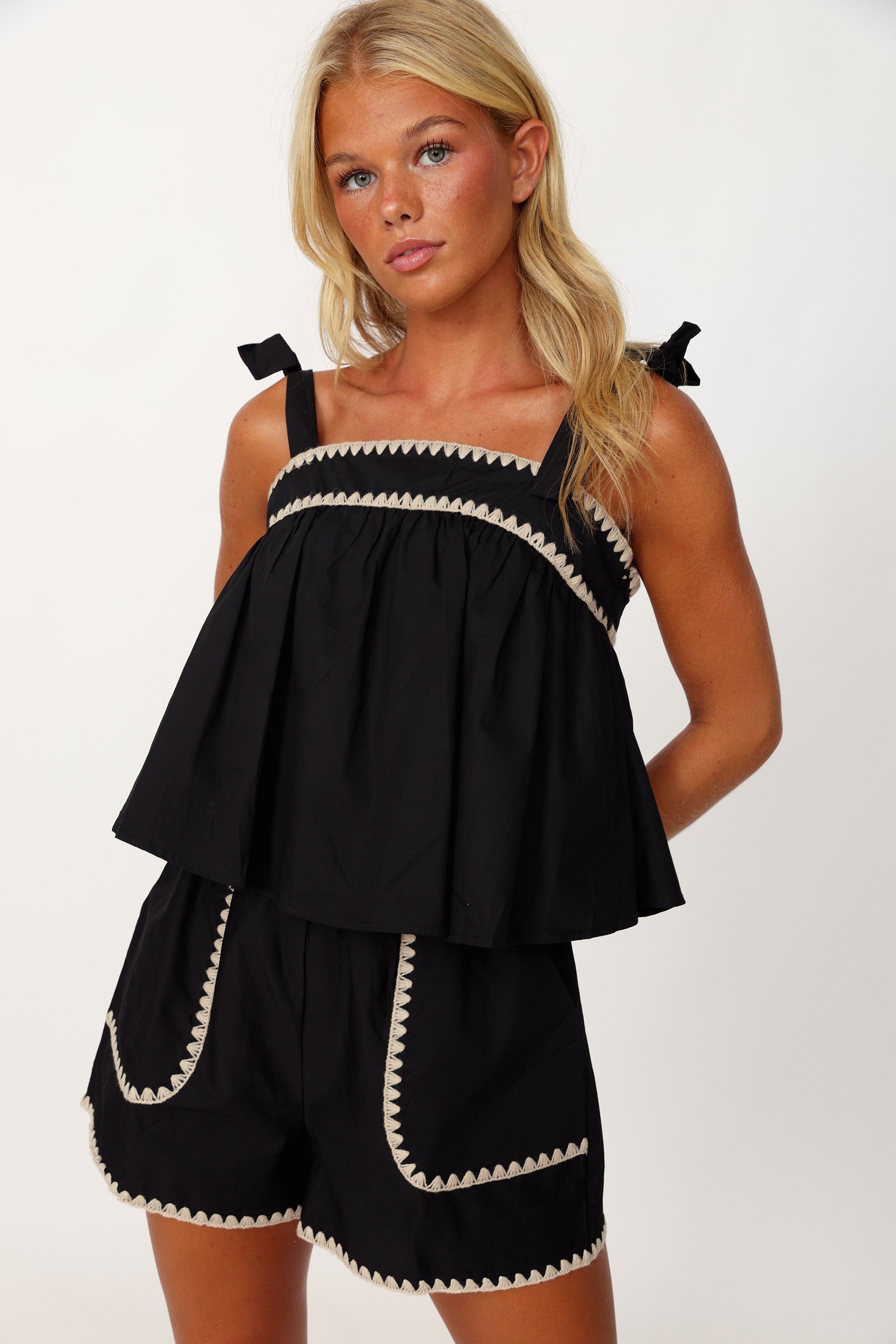 Elevate your wardrobe with our Madrid Scalloped Top, a versatile piece that combines style and comfort effortlessly. Featuring a sleeveless design with tie shoulder detail, open back, and charming babydoll style with rick rack trim, this top is perfect for any occasion.