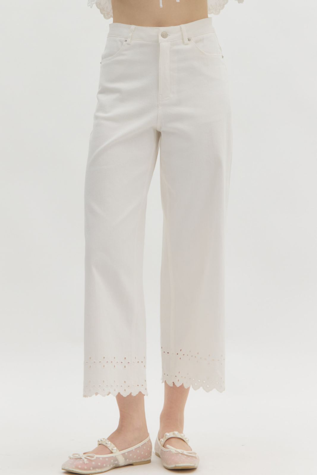 - Scalloped eyelet trim at the hem