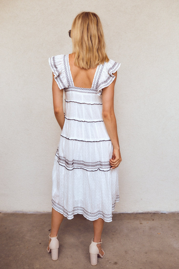 Stay sweet and springy in the Moxy Short Sleeve Tiered Midi Dress. This dress features a ruffle sleeve, square neck, black trim detail, and a flowy silhouette throughout. Pairs perfectly with a pair or wedges and a fun hat for the perfect vacation look!