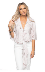 Go out and embrace your wild side with the Muse Top! Lightweight fabric, with a fun blush pink, taupe, and white snake print, shapes this chic top that has a v neckline and three quarter length sleeves. Relaxed bodice along with a front tie to add a touch of drama. Perfect for an easy, but on trend look! Pairs perfectly with white jeans for a spring look.