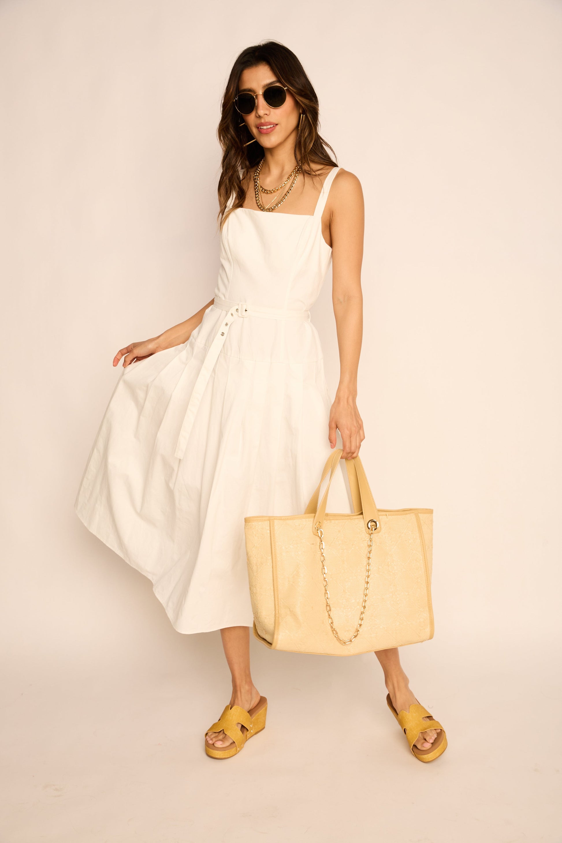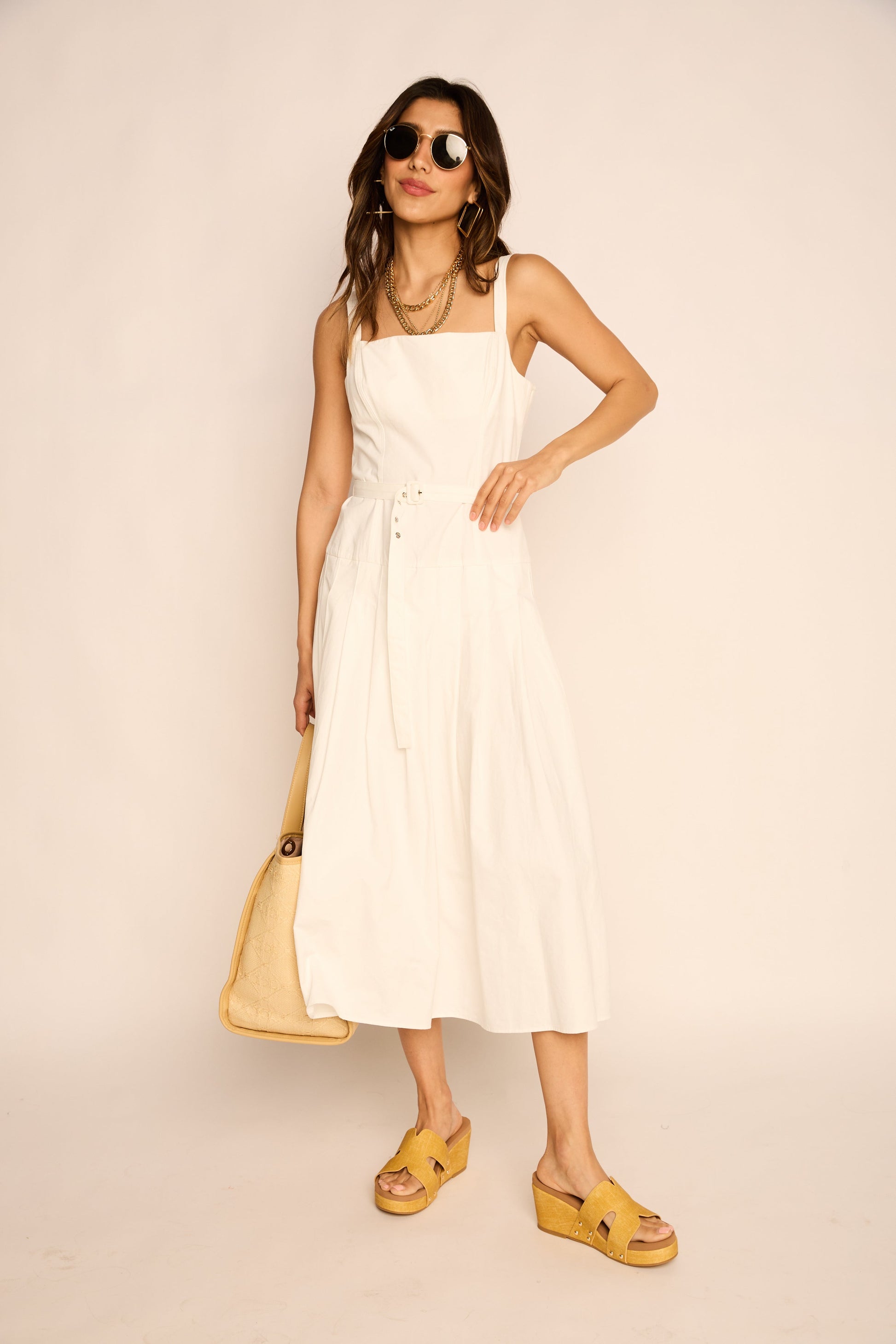 Our Natalie Belted Midi Dress features a chic square neckline, a flattering waist-cinching belt, and a timeless silhouette. Perfect for effortless sophistication and versatile styling.