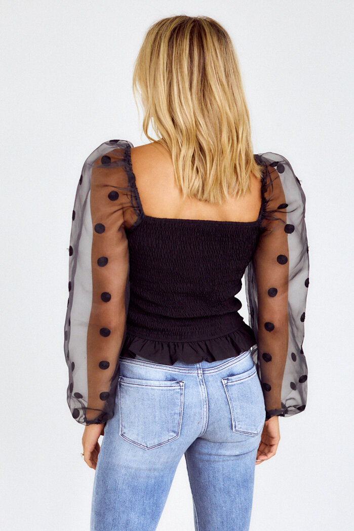 Stay on trend in the Nina Polka Dot Smocked Bodice Top! This top has a square neckline, sheer long puff sleeves with polka dot detail, and a smocked bodice. Style this fabulous top with denim or a skirt for the perfect going out look!
