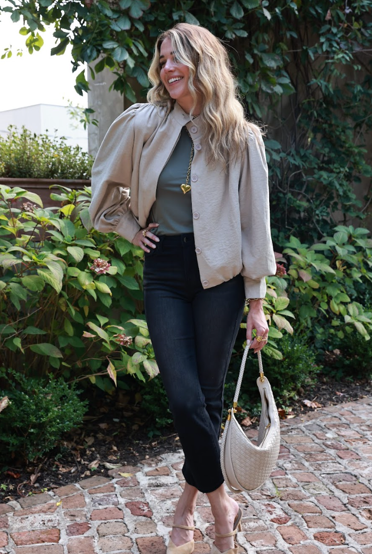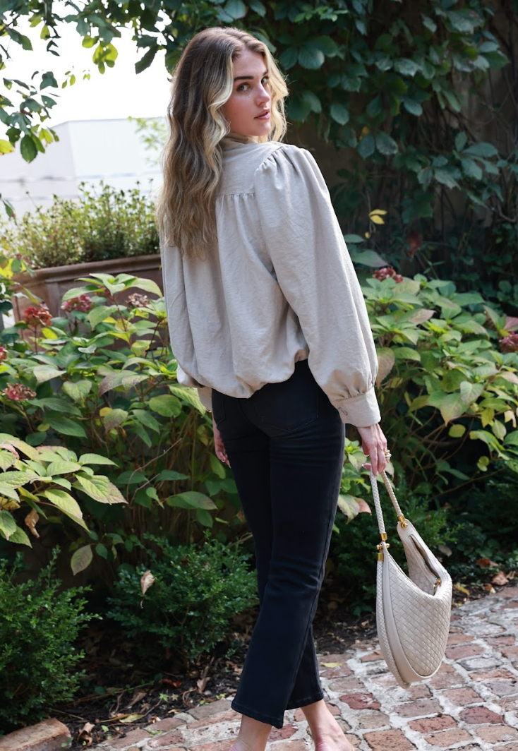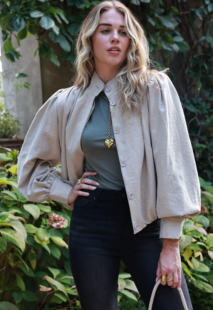 Effortlessly chic, this beige jacket features a round neckline and short sleeves for a modern, minimalist look. Crafted from soft, comfortable fabric, its balloon-hem silhouette adds a subtle, playful volume, making it perfect for layering over dresses, tops, or tailored pieces.