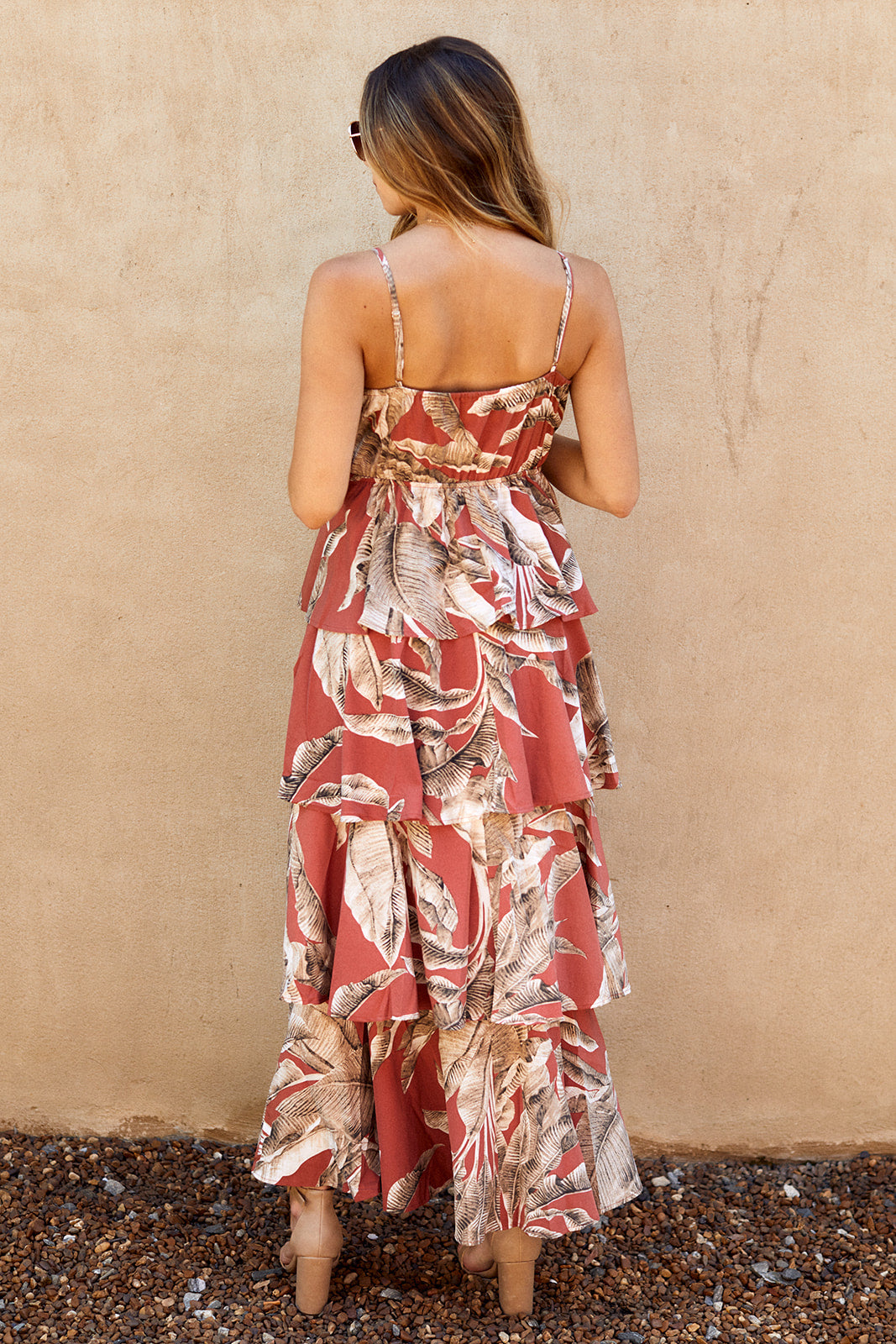 Layers of palm printed tiers makes the Rio Sleeveless Tiered Maxi Dress absolutely event worthy. This ankle-grazing, sleeveless maxi dress is crafted with a cinched-in elastic waist, adjustable straps, and a hook-and-eye closure at the bust with a self tie detail that gives a special touch to this gorgeous maxi. Pair with a nude heel for any event this season.