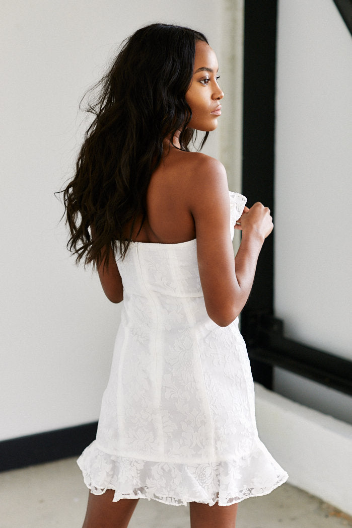 Classic white strapless floral mini dress. This dress features a strapless top, ruffled hemline, and a ruffle going down the front of the dress. Pairs perfecly with nude strappy heels and a statement handbag. An ideal dress for Easter, bridal shower, or spring wedding!