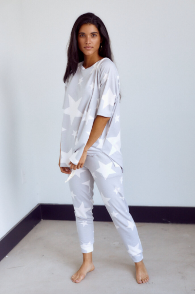 Stay cozy this summer in the Scarlett Star Print Lounge Top. This top has a round neck, short sleeves, and a relaxed fit throughout. Pair this top with the Scarlett Star Print Lounge Jogger or with denim shorts for a causal look.
