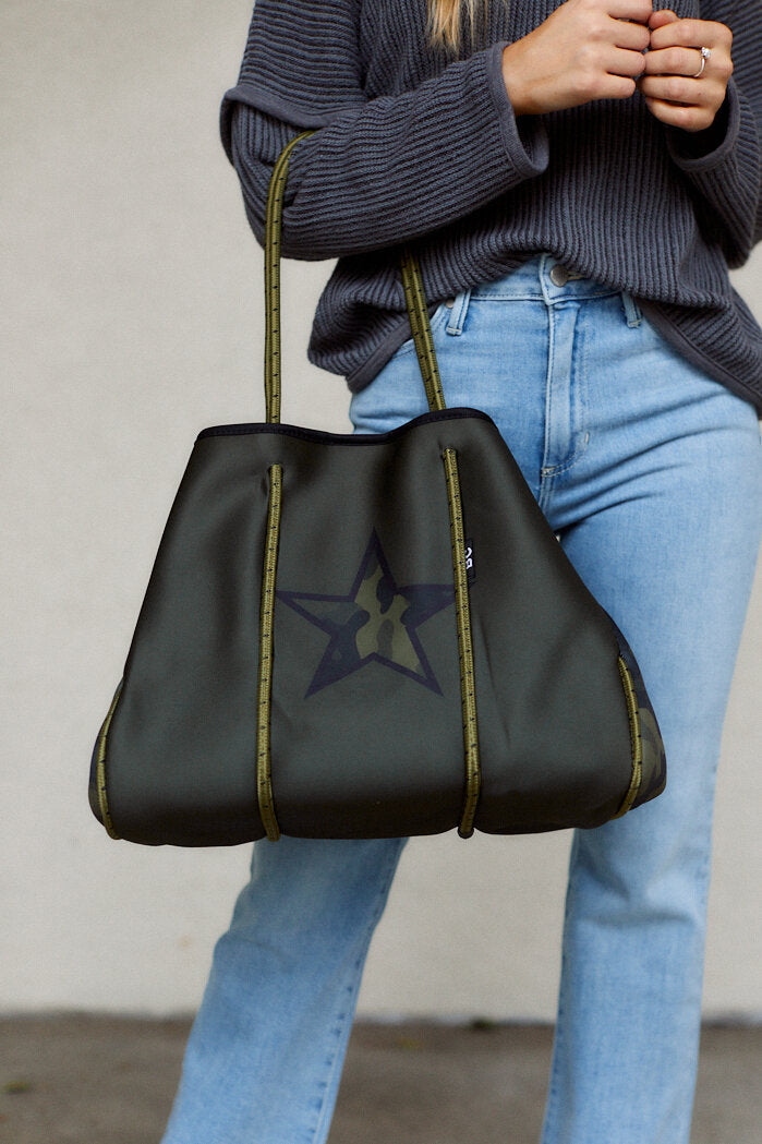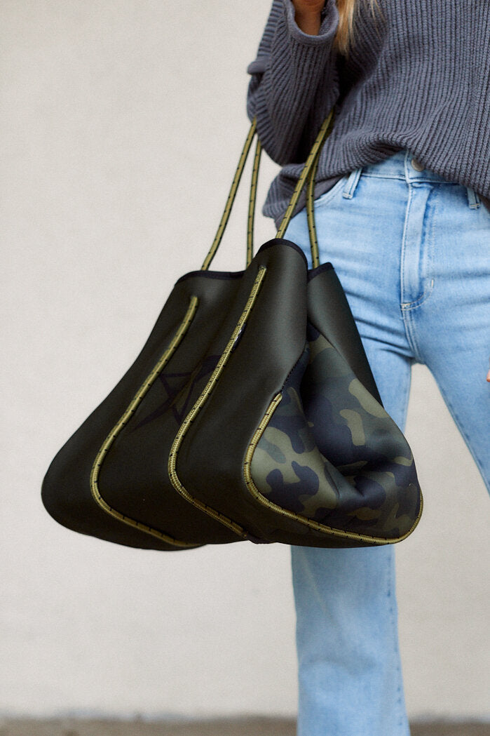 A tote that you will carry every day. The Scottsdale Star Tote is an oversized tote with a camo print and a star detail.