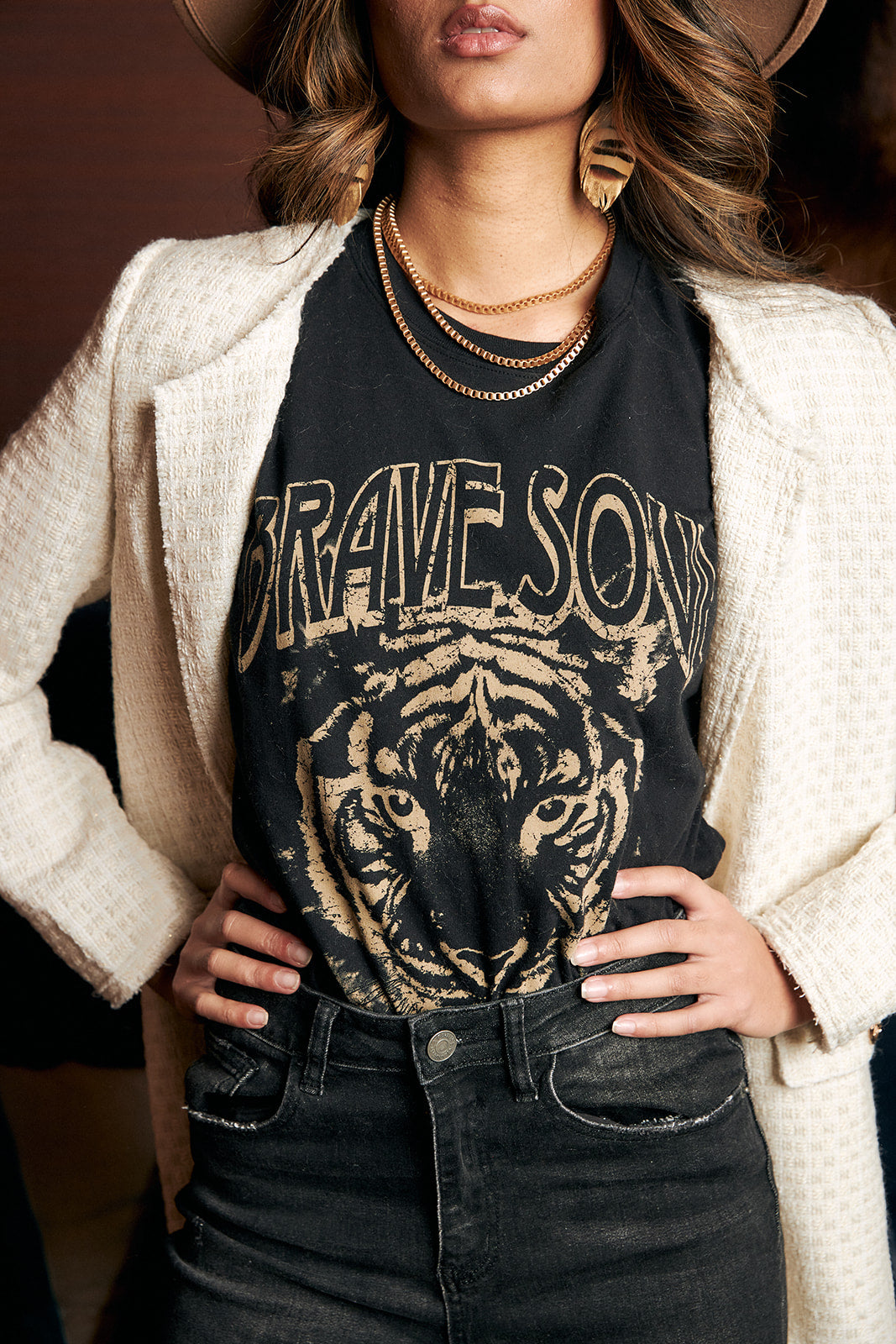 Chic and trendy, the Shells Tweed Blazer is a must-have! This blazer is tailored for a slightly oversized fit and features front flap pockets. Add a graphic tee and dark denim to complete the look.