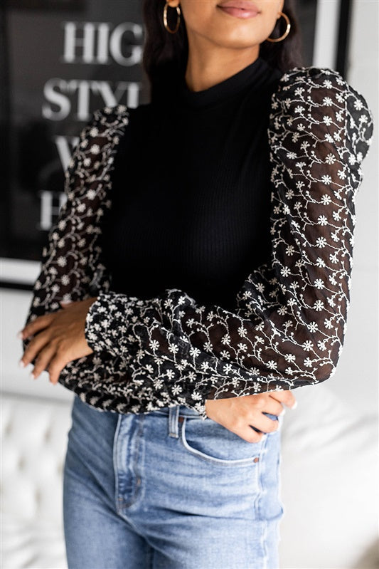 Suspended in ditsy floral sleeves, the Stanton Floral Sheer Sleeve Bodysuit is perfect for all things fall! This bodysuit features a high neck, snap button closure, and figure-hugging fit. Pair with leather pants or denim this season.