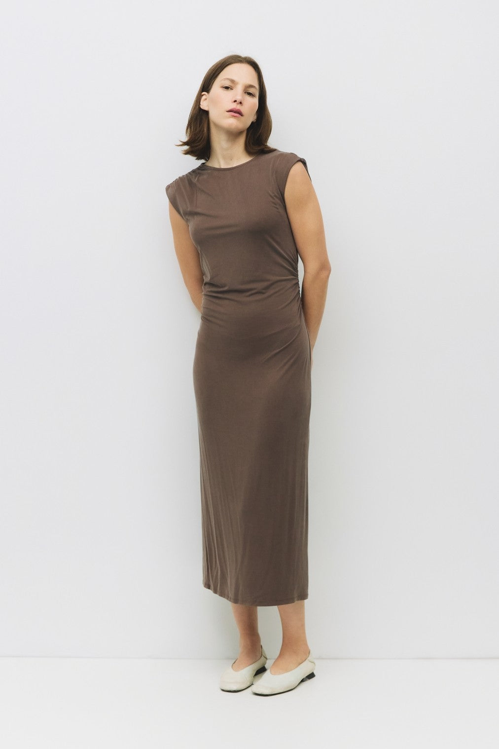 Effortlessly versatile, this short-sleeve dress features a classic round neckline and soft, comfortable fabric. Its solid color design makes it a wardrobe staple, perfect for layering with jackets and accessories or wearing on its own for a polished, everyday look.