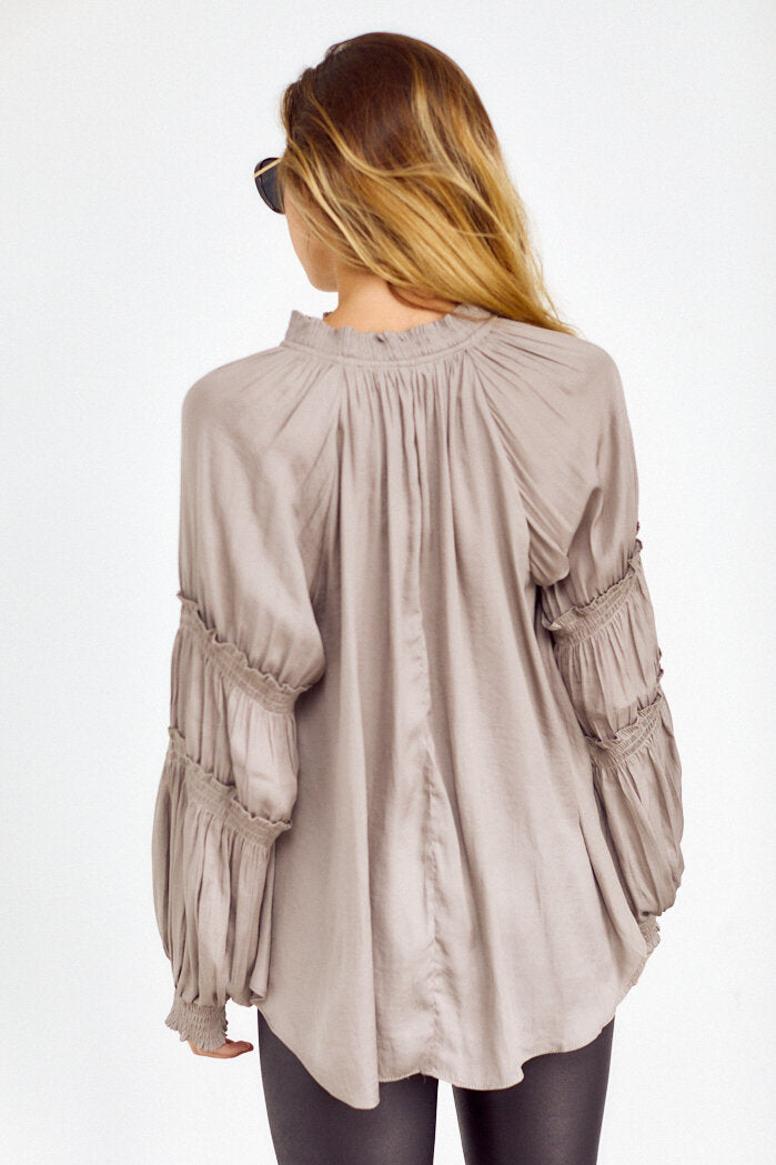 The smocking details and a satin-like fabrication elevate the Tinsley Top from your everyday blouse. This top features an exaggerated ballon style sleeve and a v-neckline. Effortless pull-over styling makes this top ideal to tuck into your favorite fall denim.