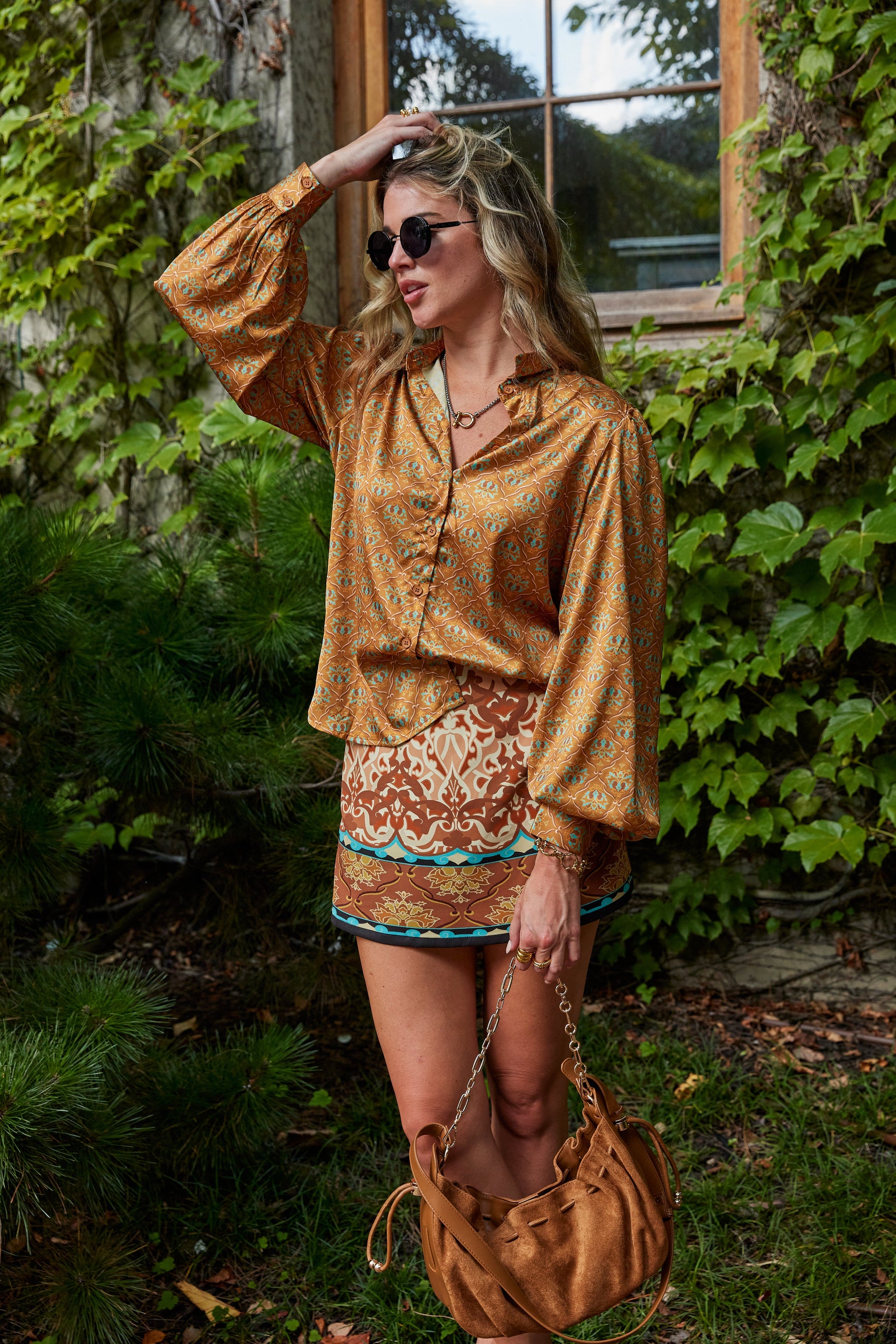 A playful twist on a fun print, this paisley button-up top is perfect for both workdays and weekends. Featuring a flattering V-neckline, delicate short pleated sleeves, and a classic button-front placket, it’s lightweight and easy to style. Pair it with denim for a relaxed vibe or tuck it into tailored bottoms for a polished finish.