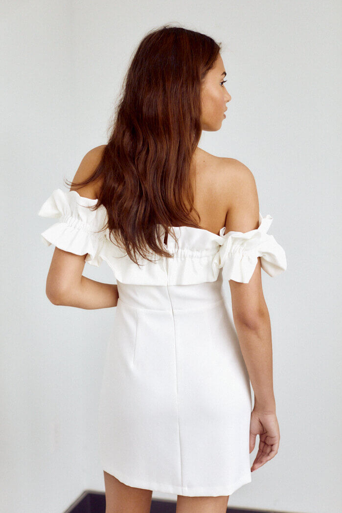 Calling all brides! The Veronica Ruffle Detail Mini Dress is off the shoulder with ruffles along the sleeves and throughout the back, hidden zipper closure in the back, and features a fitted bodice throughout. Dress it up with nude heels for any upcoming event!