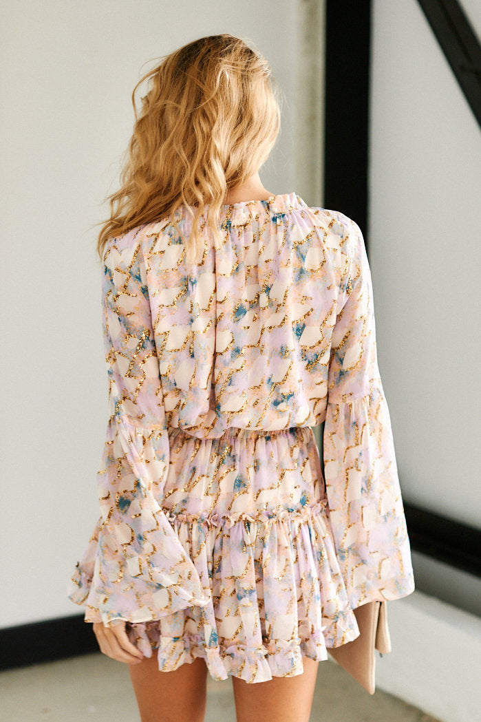 Fun and flirty floral mini dress with an elastic cinched waistband. This spring must have features metallic accents, bell sleeves, a tie front v-neckline, and a ruffled hem. This dress pairs perfectly with a nude strappy heel and a light denim jacket. Dress up for a garden wedding or keep it casual for a brunch date.